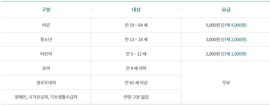 국립생태원 요금표는 아래와 같습니다.