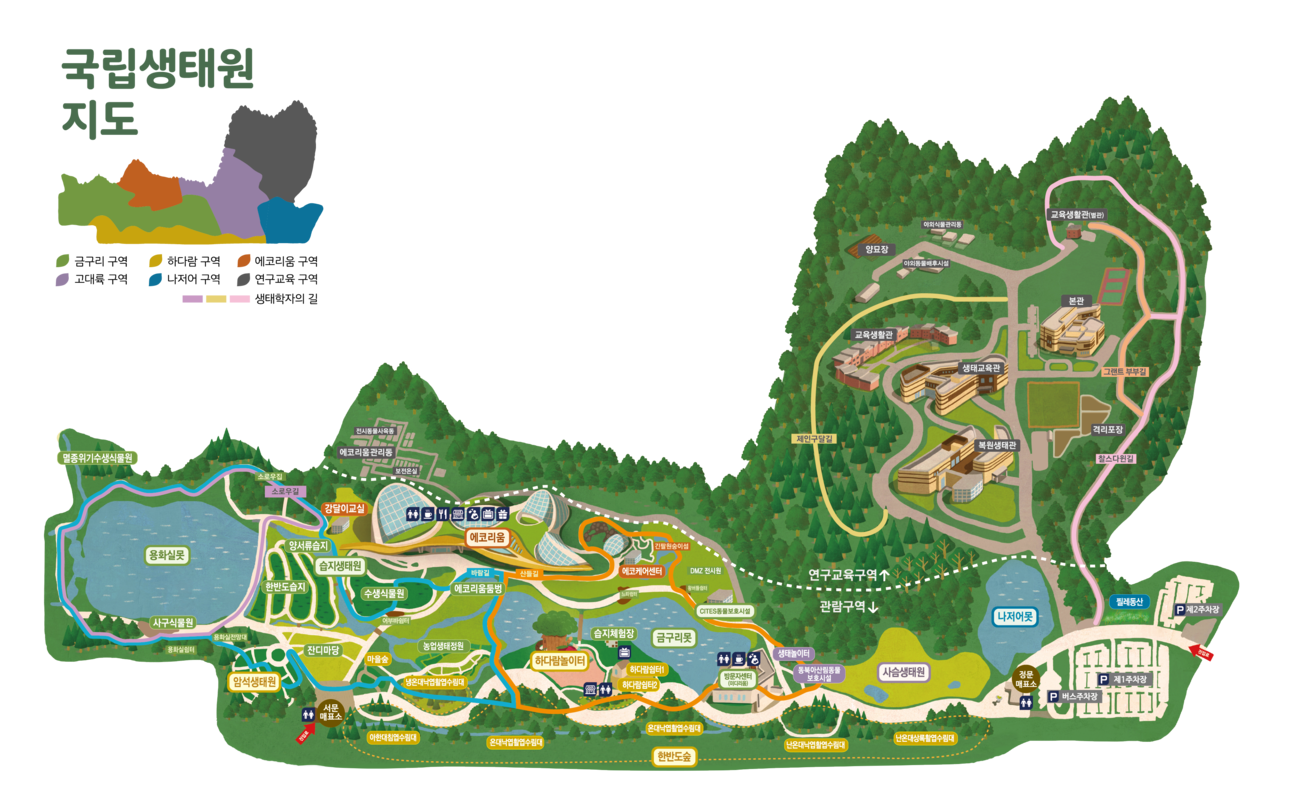 한반도숲, 암석생태원, 습지 등 다양한 생태계를 관찰할 수 있게 구성되어 있습니다.