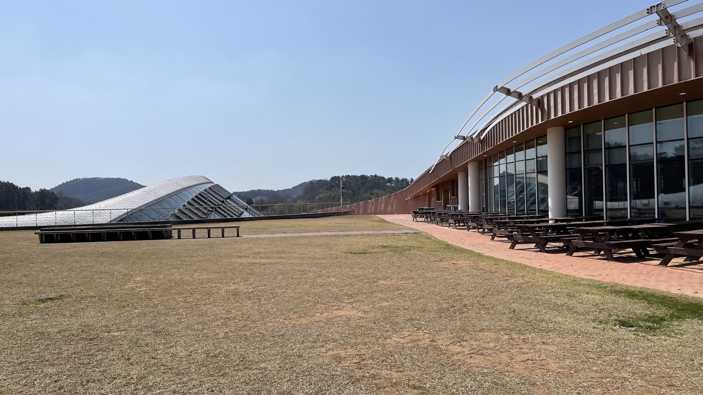 에코리움 옥상에는 넓은 잔디와 음식을 먹을 수 있는 테이블들이 마련되어 있습니다. 하지만 그늘이 없어서 더운날 이곳에서 식사하기는 힘들것 같다는 생각이 들었어요.