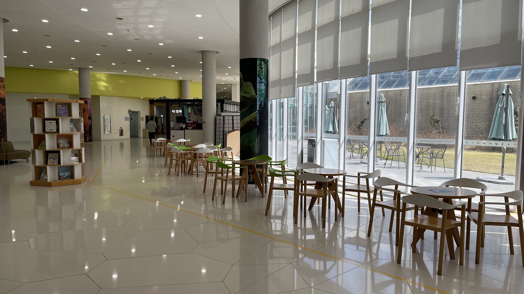휴식을 취할 수 있는 테이블과 관련 서적들이 전시되어 있습니다.