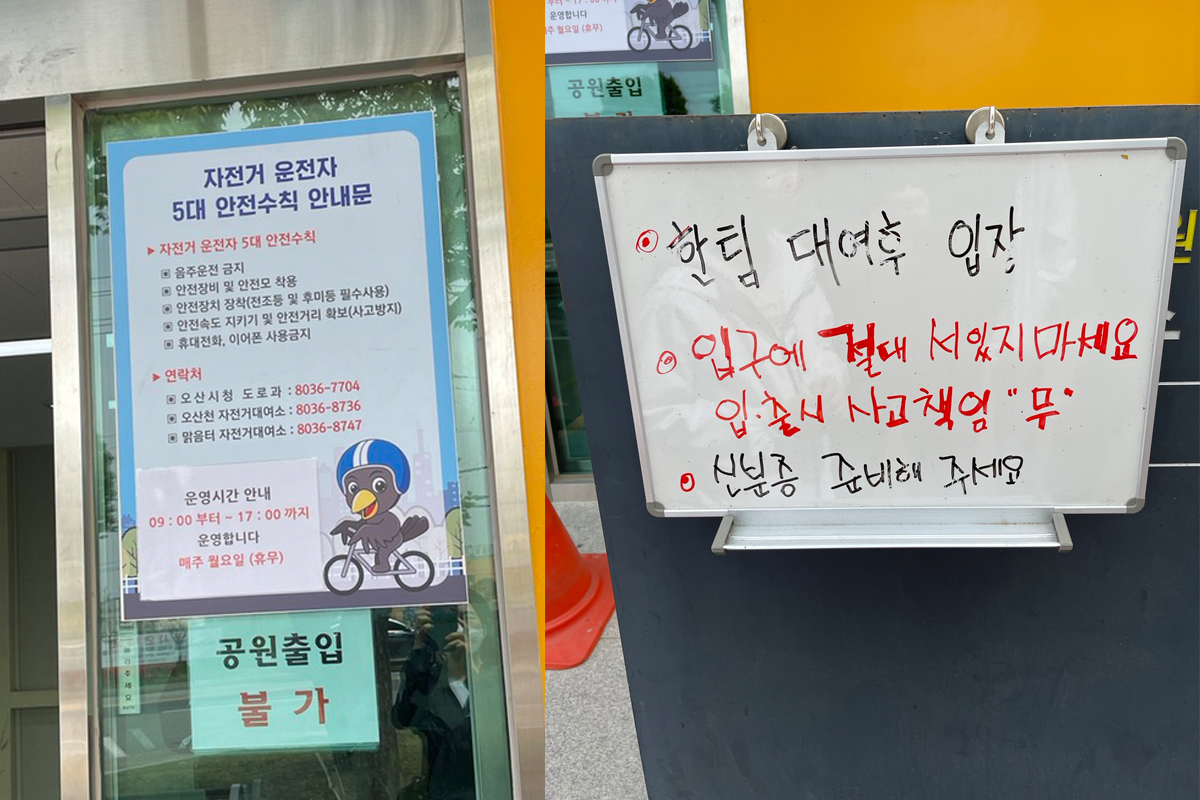 여기서 빌린 자전거를 타고 맑음터 공원에 출입하면 안된다는 안내문이 붙어 있어요.
