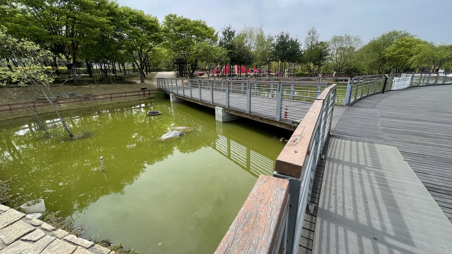 하지만 물의 녹조가 너무 심해서 물고기들이 잘 보이지 않았습니다. 희미하게 보이는 잉어들의 크기만 가늠할 정도? 잉어들은 꽤 커 보이더라고요.