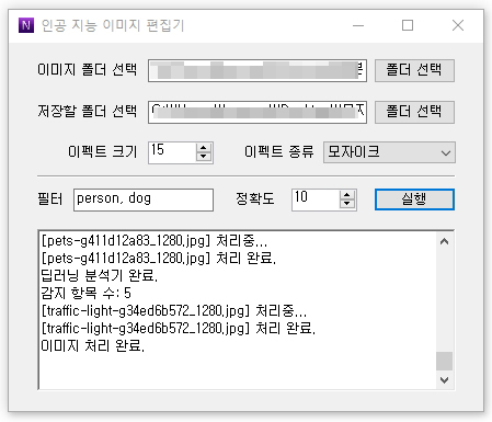아래 사진은 같은 사진을 대상으로 필터 항목을 dog로 하여 실행시킨 결과입니다. 개만 모자이크 처리가 됐죠?