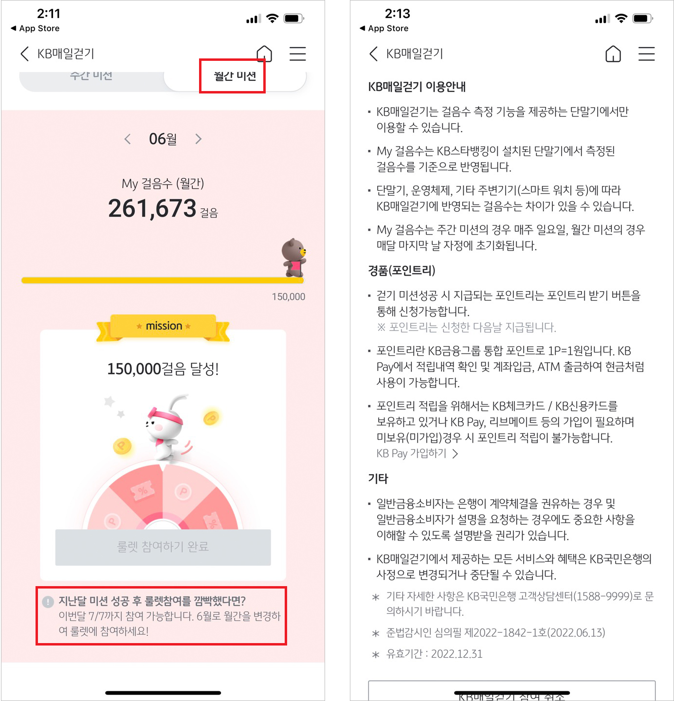<월간미션> : 한 달 동안 150,000걸음을 달성하면 룰렛 게임에 참여할 수 있습니다. 룰렛을 돌려 해당하는 포인트나 쿠폰을 받을 수 있습니다. 깜빡하고 지난달 미션에 참여하지 못했다면 1주일 더 참여할 수 있는 기회를 제공하고 있으며, 그 기한 동안에도 참여하지 않는다면 참여 기회는 없어집니다.