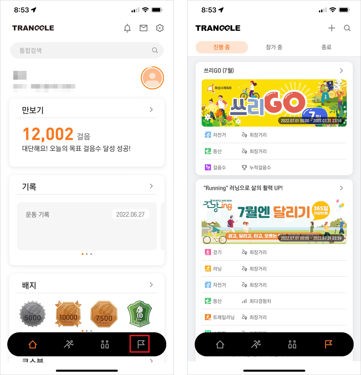 트랭글 메인화면 하단의 깃발 아이콘을 클릭하면 진행중인 챌린지 리스트를 볼 수 있고, 참여해 보고 싶은 챌린지에 참가하기 버튼을 눌러 신청 할 수 있습니다.