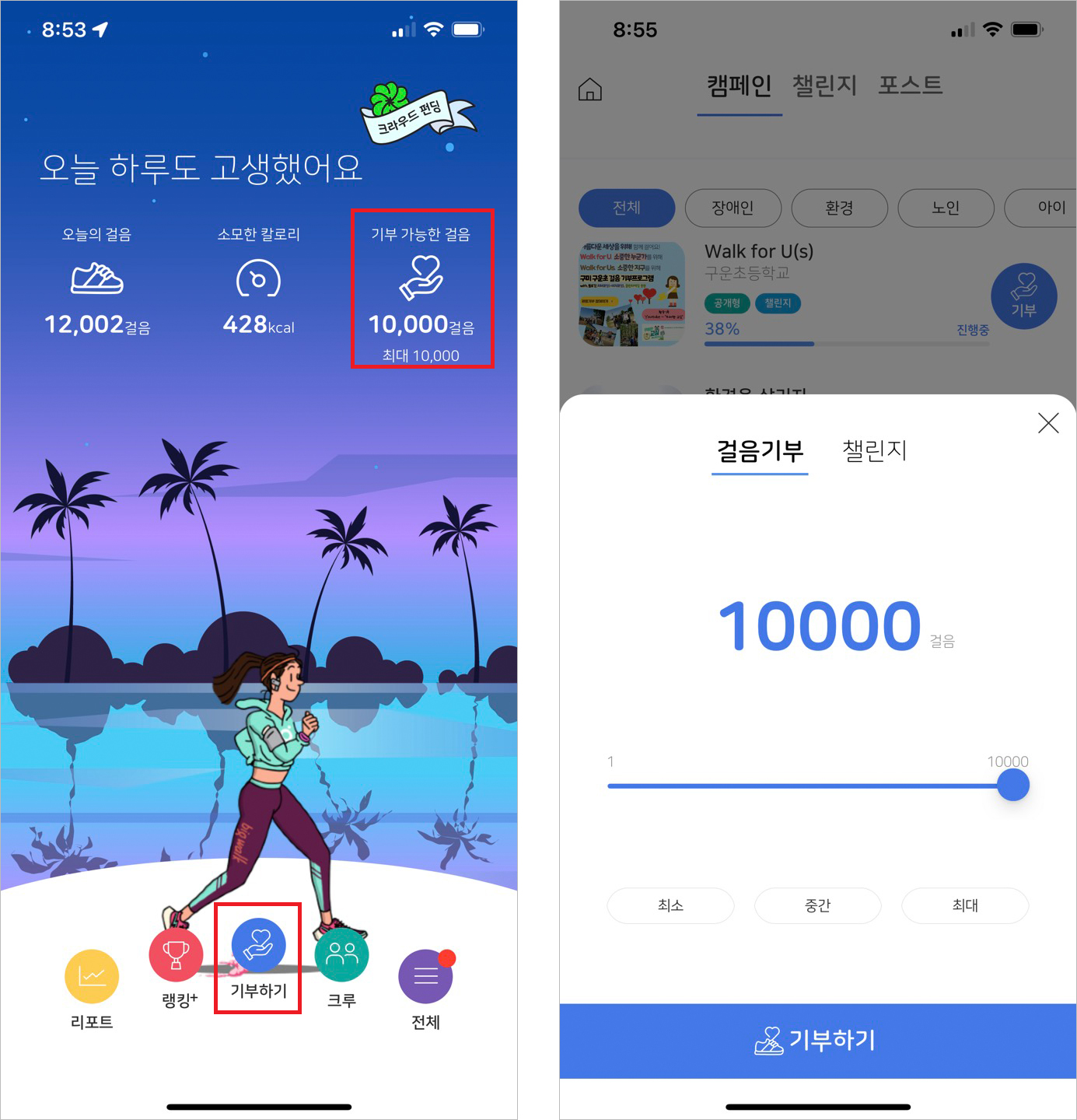 만보걷기로 건강과 포인트를 챙기는 것에 그치지 않고 '빅워크'라는 앱을 통해 기부 활동도 할 수 있습니다.