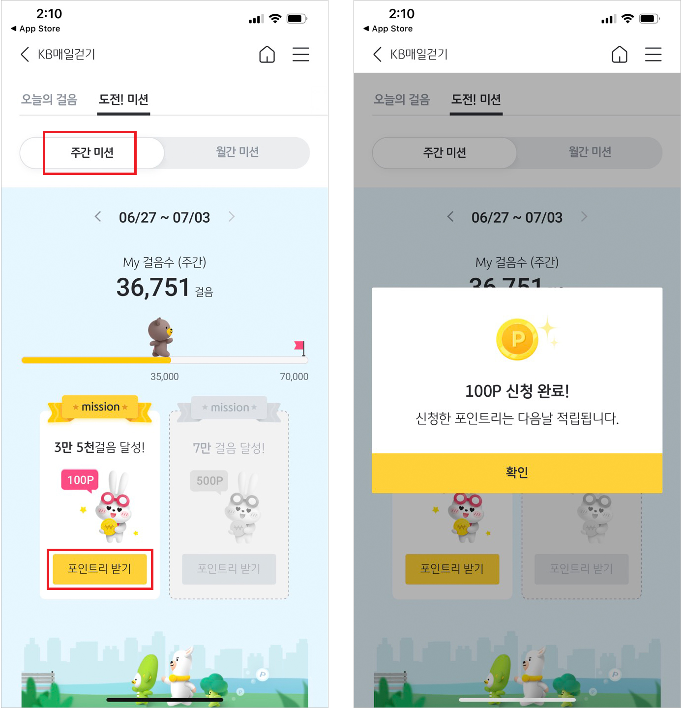 <주간미션> : 1주일 동안 35,000걸음을 달성하면 100P / 70,000걸음을 달성하면 500P의 포인트리를 신청할 수 있습니다. 포인트리 지급은 신청한 다음날 적립됩니다.