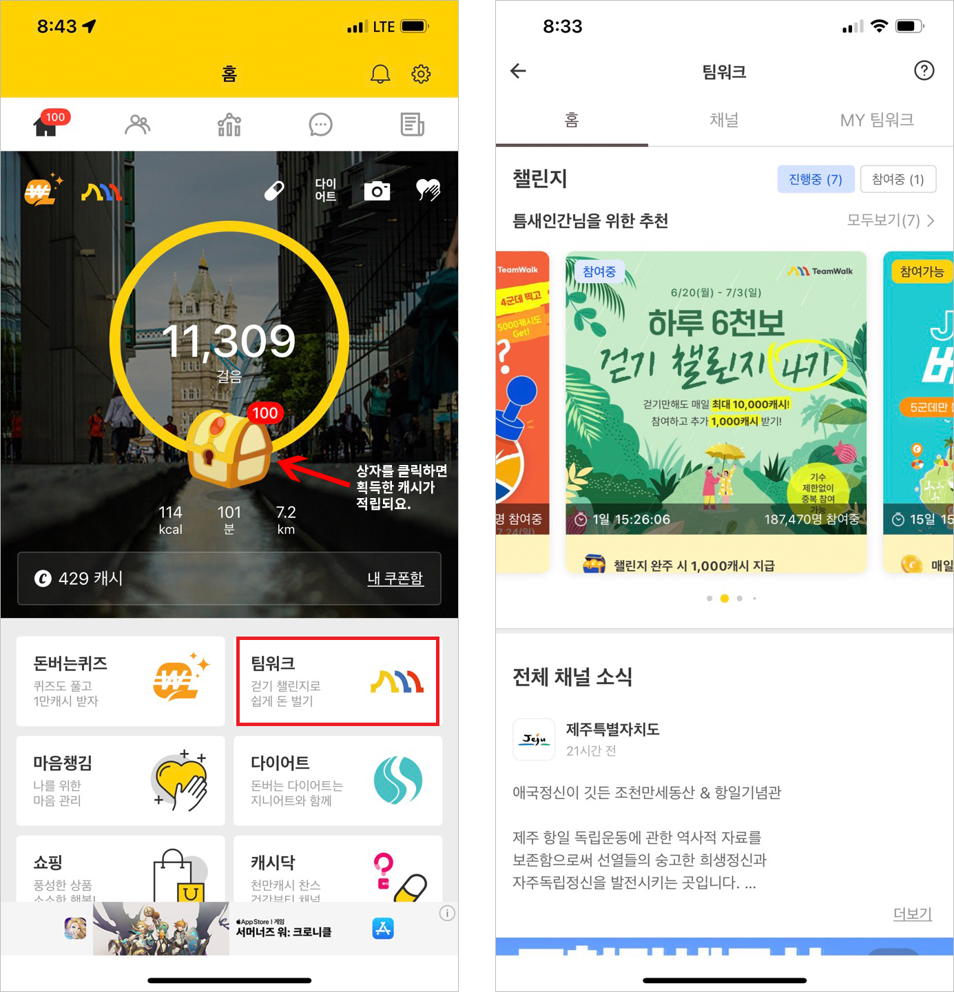'팀워크' 카테고리에 등록되어 있는 다양한 걷기 챌린지에 참여하여 캐시를 쌓을 수도 있습니다.