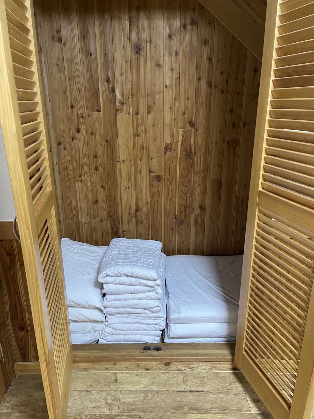 이불장 안에는 6인이 사용할 수 있는 이불과 베게가 준비되어 있습니다. (사진상으론 좀 부족해 보이는데, 사용하느라 몇 개 빼고 난 후 사진 찍어서 그래요^^; 이불, 요, 베게 모두 6개씩 있습니다.)