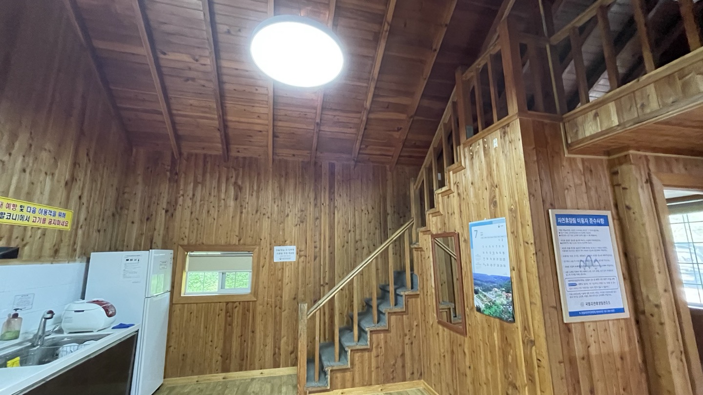 저희가 묵은 곳은 숲속의 집 '꾀꼬리'동입니다. 6인실이고, 거실겸 주방, 방, 다락방이 있는 구조입니다.