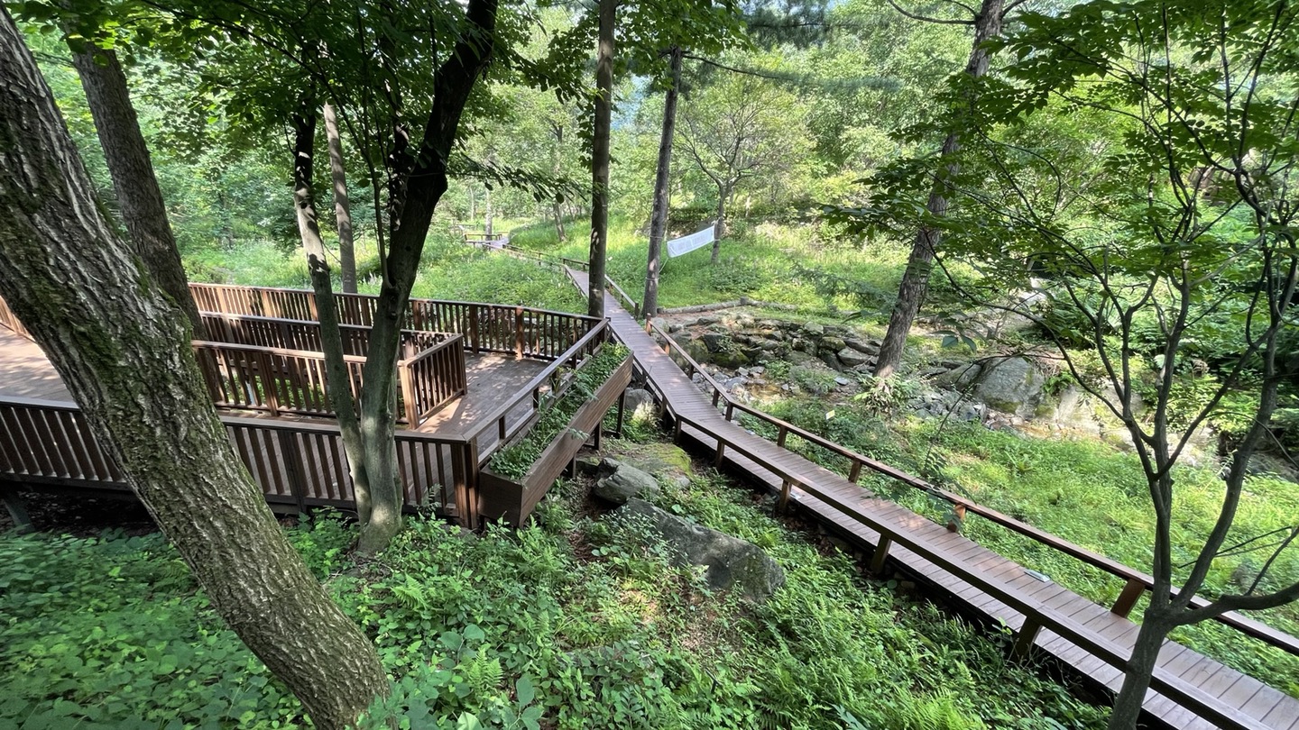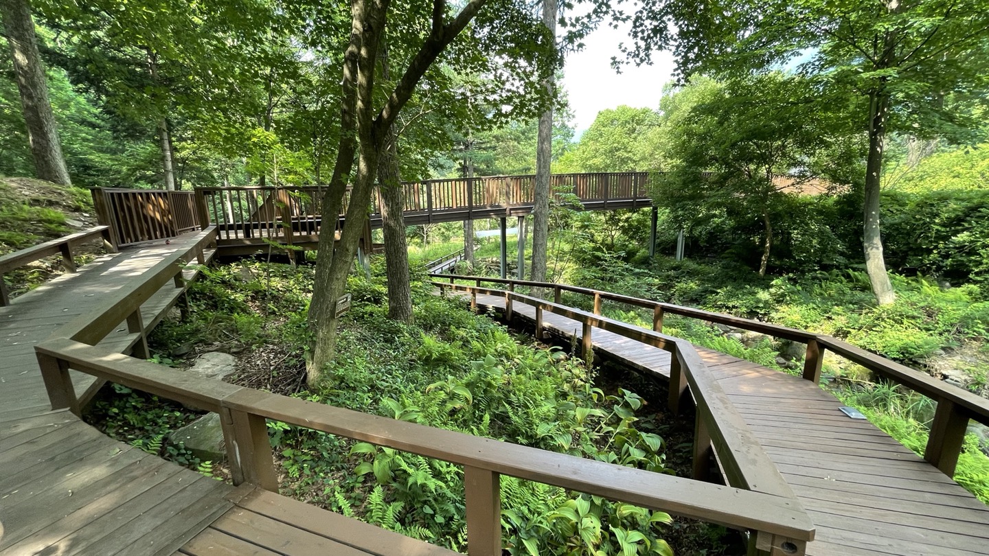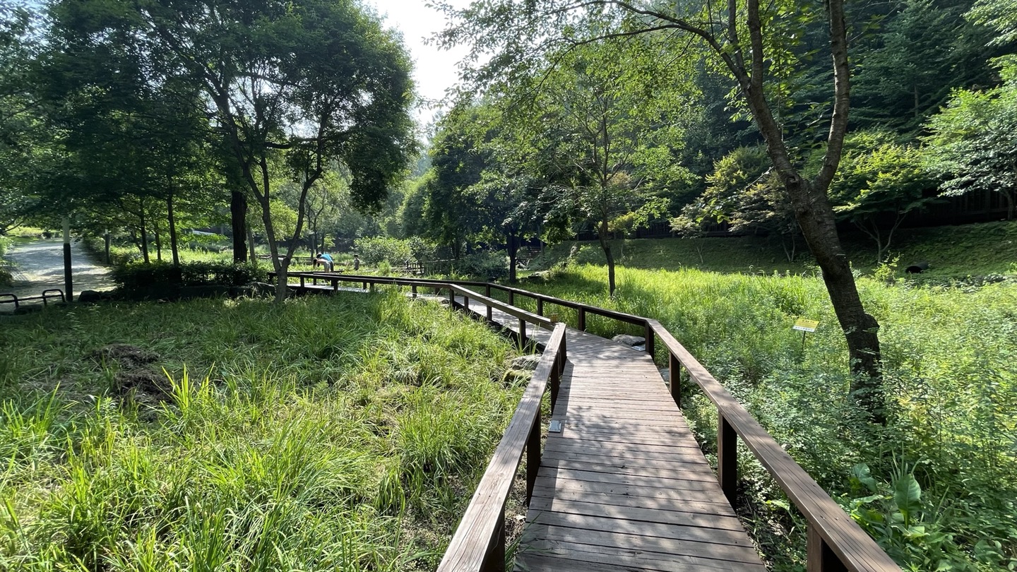 유명산 자연휴양림 내에 있는 자생식물원입니다. 관찰로가 나무데크로 잘 조성되어 있어 걷기 좋습니다.