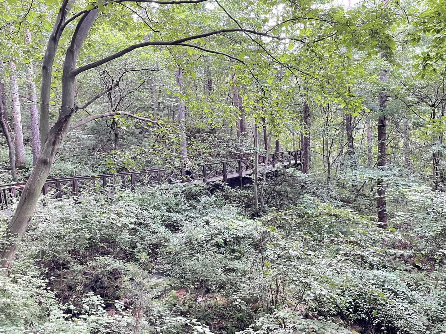 유명산 자연휴양림에는 나무데크 산책로가 있는데요, 걷기 편하고 왕복 30분 정도로 길이도 적당해서 아이들과 산책하기에 좋았습니다.