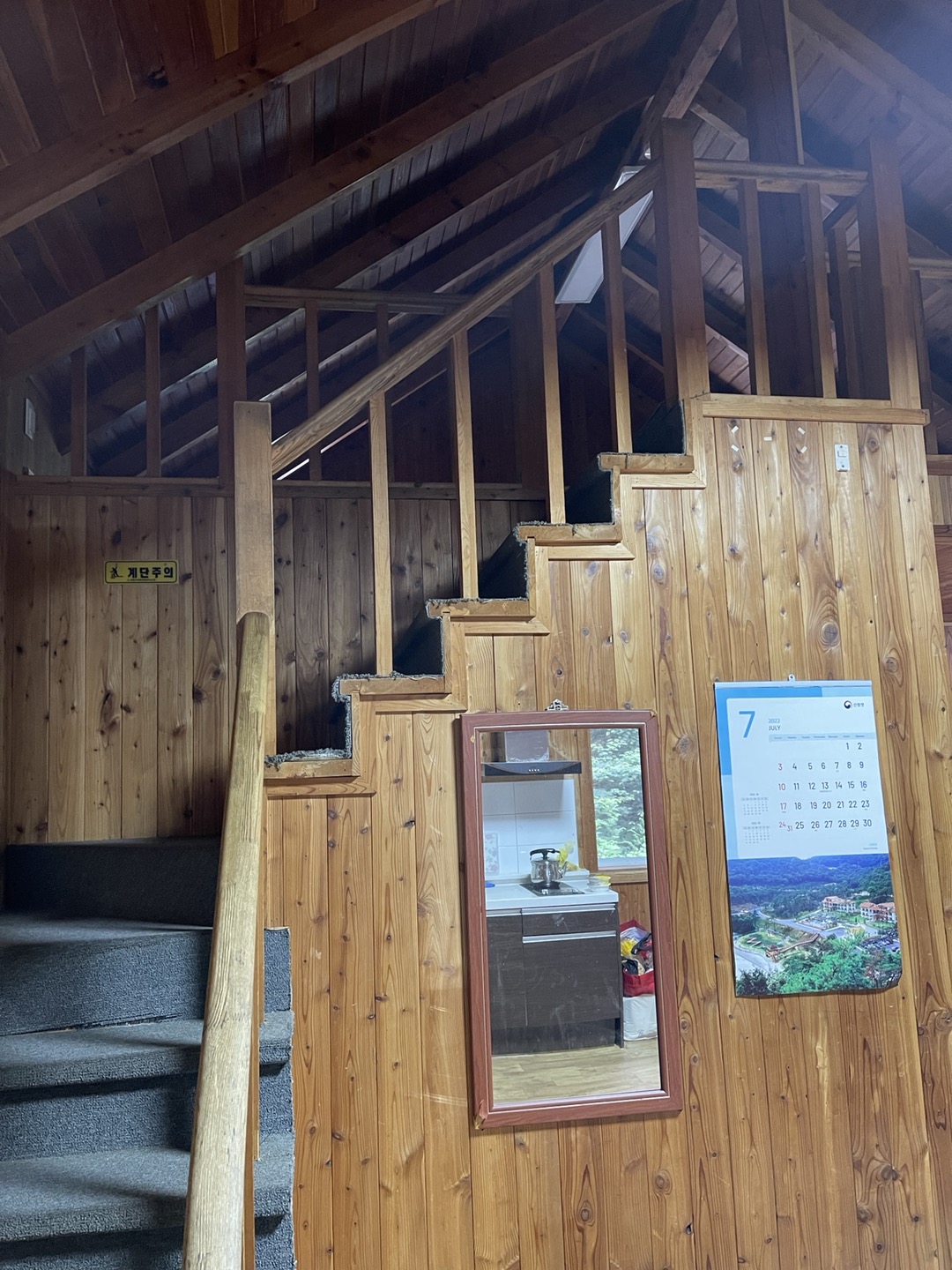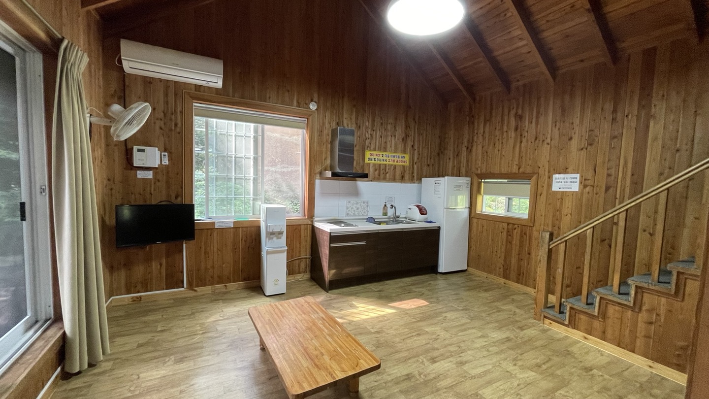 저희가 묵은 곳은 숲속의 집 '꾀꼬리'동입니다. 6인실이고, 거실겸 주방, 방, 다락방이 있는 구조입니다.