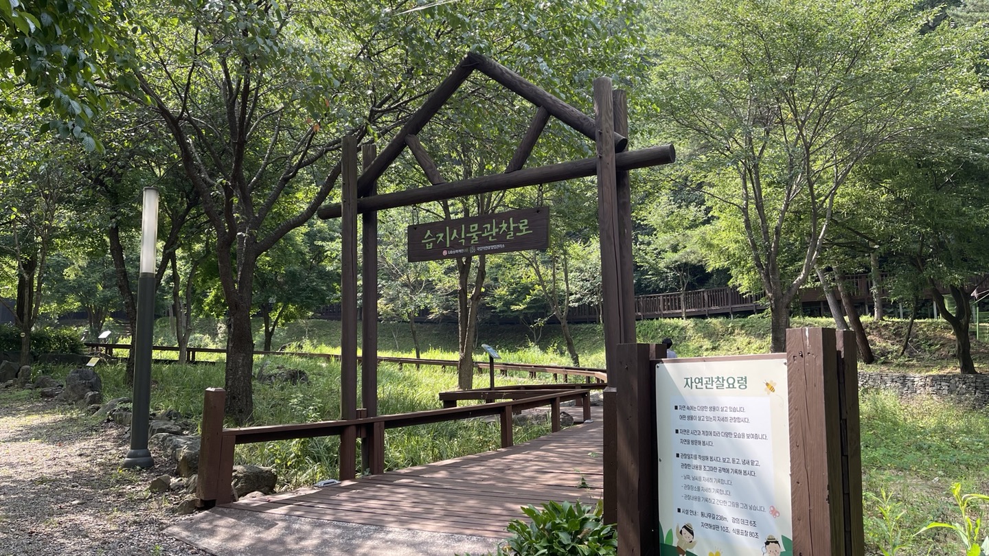 유명산 자연휴양림 내에 있는 자생식물원입니다. 관찰로가 나무데크로 잘 조성되어 있어 걷기 좋습니다.