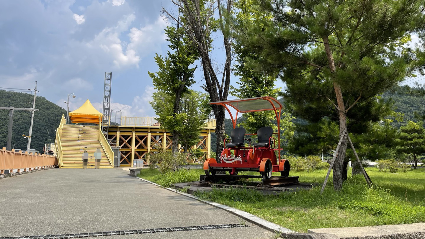 나무 아래 있는 레일바이크에 올라 기념사진 찍을 수 있어요. 레일바이크의 빨간 색과 나무의 초록색이 어우려져 사진이 이쁘게 나오더라고요^^