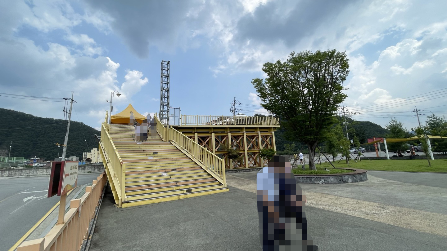 노란색 계단을 올라오면 승강장이 있습니다. 테이블과 파라솔이 있어 이곳에서 탑승 전까지 대기할 수 있습니다.