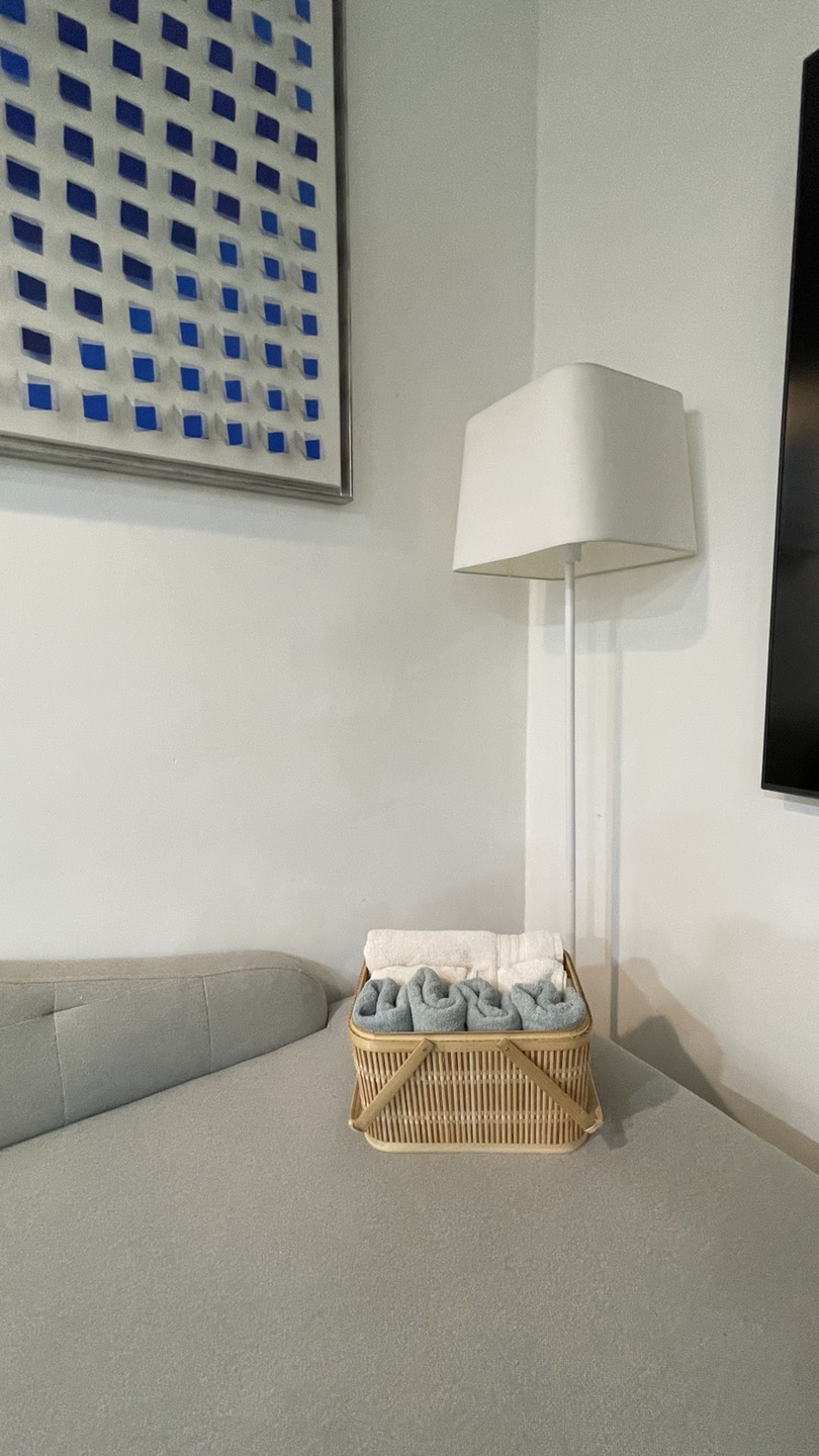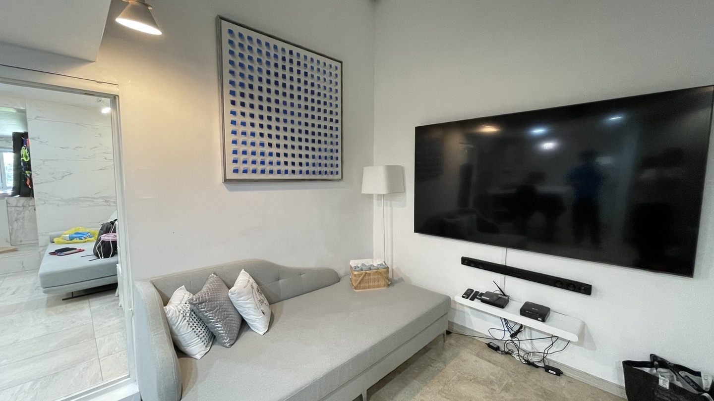 거실에는 대형 TV와 쇼파가 있고요. 소파 위에 수건이 가지런히 놓여 있습니다.