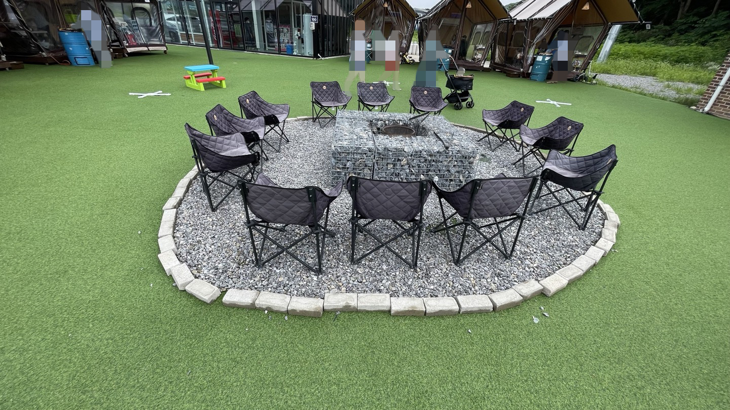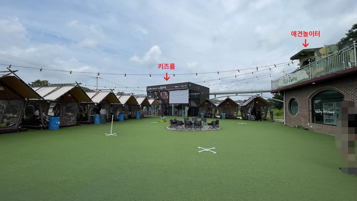 중앙에 잔디광장이 있고 바베큐존, 대형 키즈룸, 매점 건물이 빙 둘러져 위치해 있습니다. 매점 건물 2층에는 애견 놀이터가 있어요. 잔디광장 가운데는 불멍존이 있고요^^