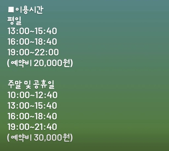 예약비용 : 평일 2만원 / 주말 및 공휴일 3만원
