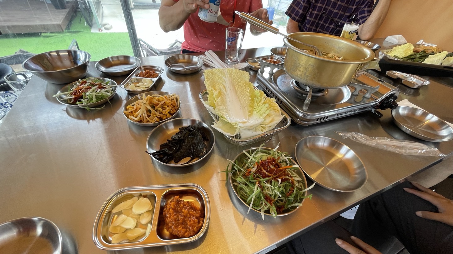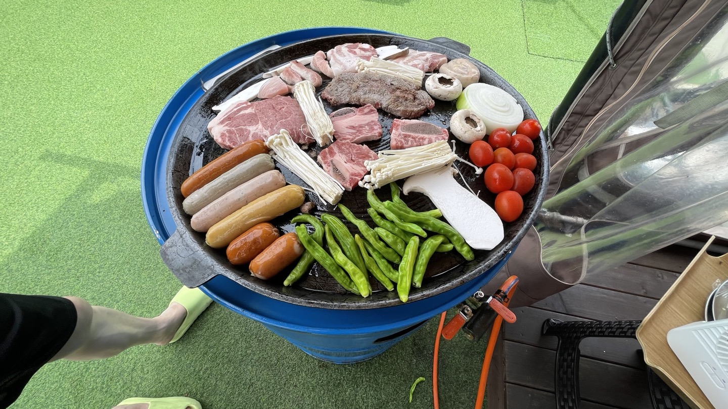 고기랑 소시지, 버섯, 토마토, 양파 등등 먹고 싶은 거 가져다 솥뚜껑에 올리면 되요^^