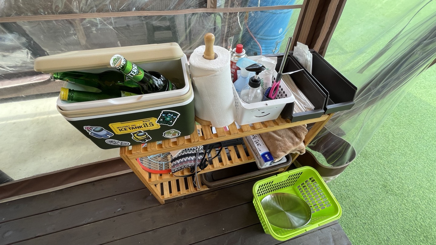 텐트 한쪽 선반에는 아이스박스, 키친타올, 전기파리채, 일회용 수저 등 식사할 때 필요한 물건들이 준비되어 있습니다.