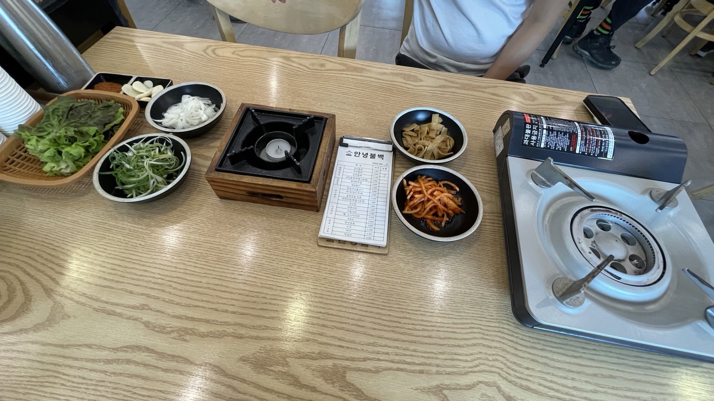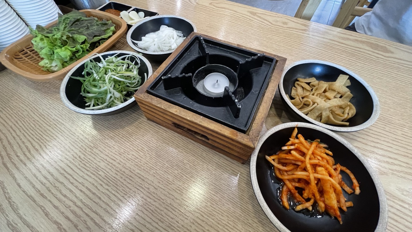 무생채, 어묵조림, 양파채, 파채, 상추, 저민마늘, 쌈장이 준비되어 있고, 반찬이 모자라면 셀프바를 이용하면 됩니다.