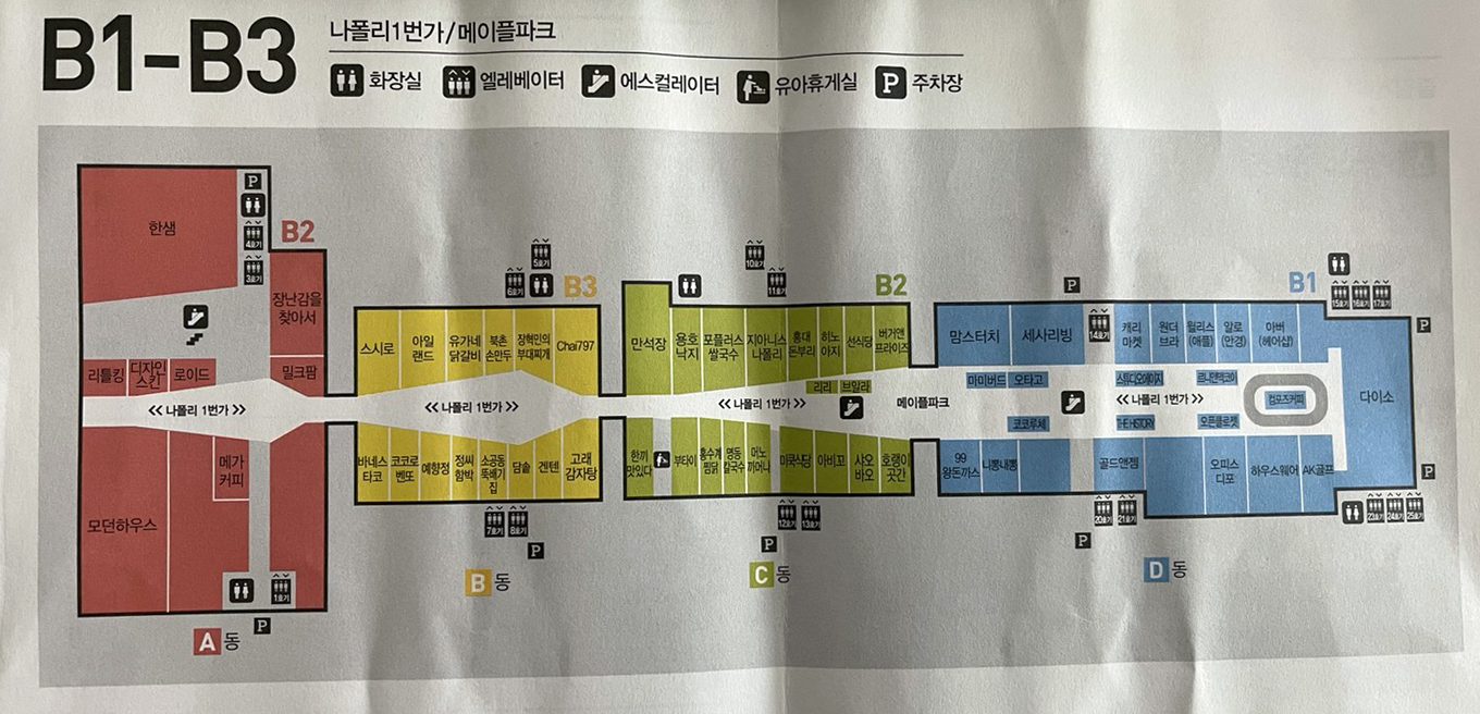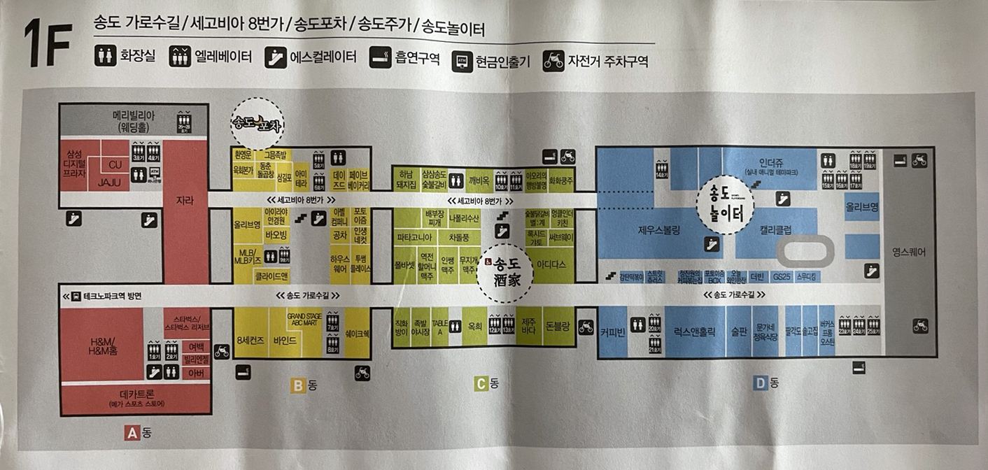 지하주차장과 일부 매장을 제외하곤 모든 건물이 통로로 연결되어 있습니다.