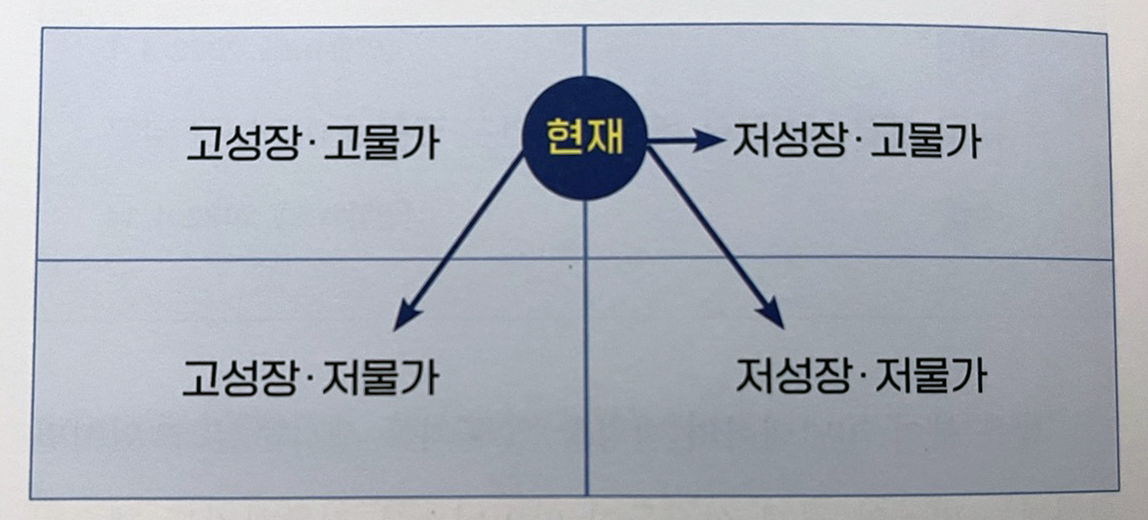 작가는 현재의 상황을 물가 측면에서는 '고물가', 성장 측면에서는 '고성장과 저성장의 중간' 정도로 진단하고 있습니다. 이런 상황에서는 아래의 그림에서 보여지듯이 '저성장/고물가', '고성장/저물가', '저성장/저물가'의 상태로 이동 가능한 상황을 가정해 볼 수 있는데요.