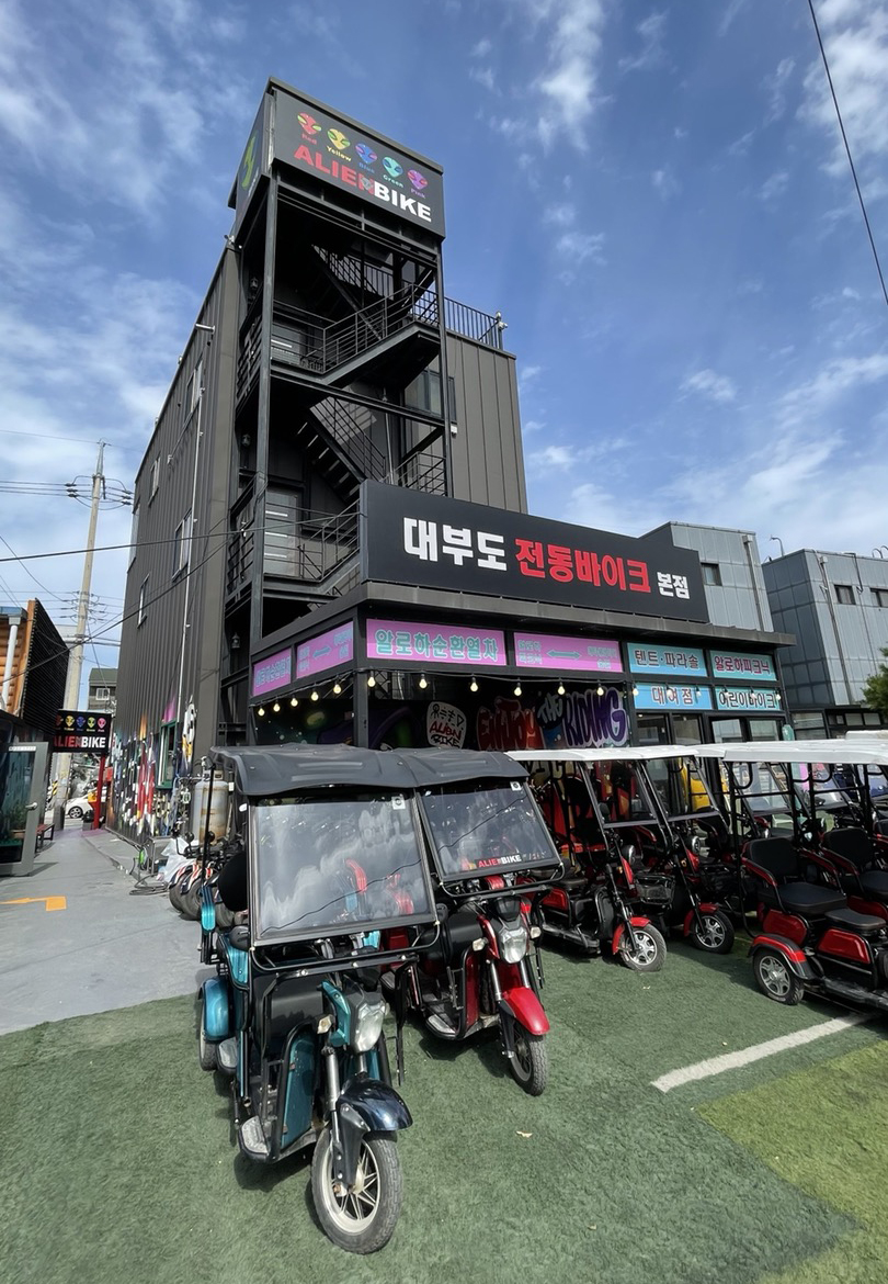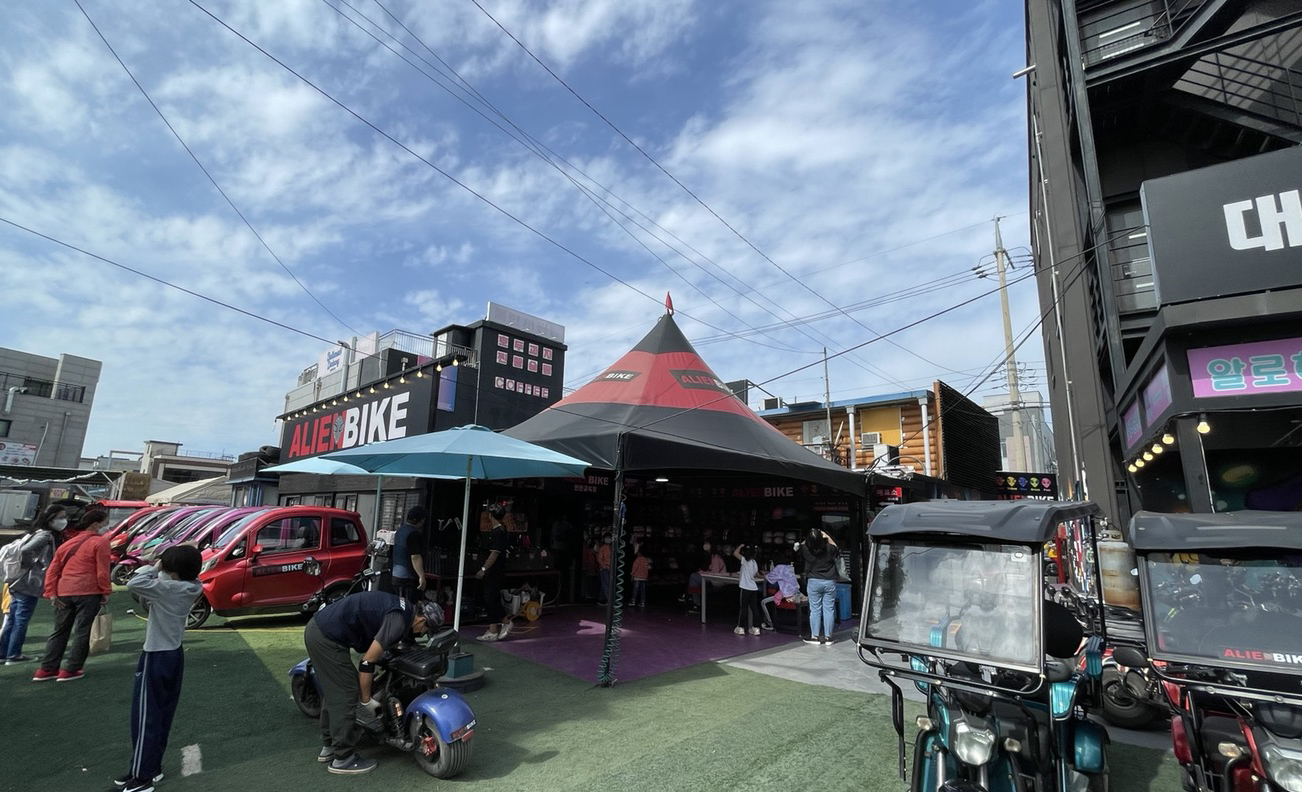 저희가 간 곳은 '에일리언 바이크'라는 대여점이었는데, 주차장 입구에서 대각선 방향 맞은편에 있기 때문에 주차장 입구쪽에서는 잘 안보여서 한참을 두리번 거리며 찾았어요. 당연히 공원 입구쪽에 있을거라 생각했었거든요^^;;