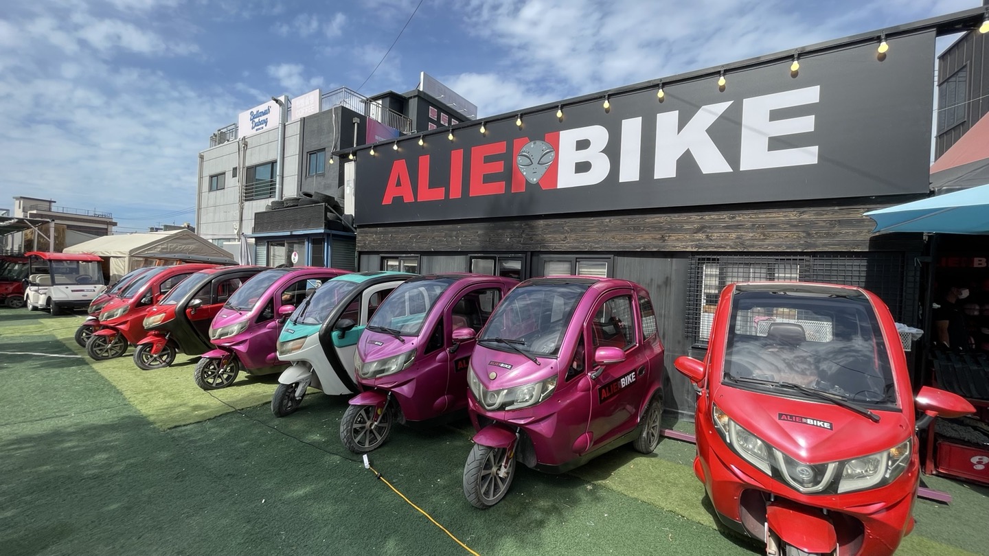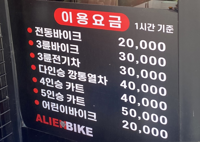 저희가 간 곳은 '에일리언 바이크'라는 대여점이었는데, 주차장 입구에서 대각선 방향 맞은편에 있기 때문에 주차장 입구쪽에서는 잘 안보여서 한참을 두리번 거리며 찾았어요. 당연히 공원 입구쪽에 있을거라 생각했었거든요^^;;
