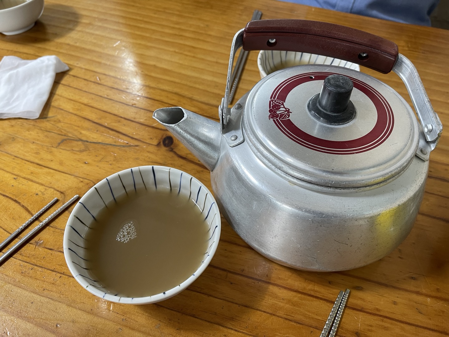주문한 음식이 나오기 전에 먼저 따뜻한 육수가 나옵니다. 진하고 꽤 칼칼한 맛이에요.