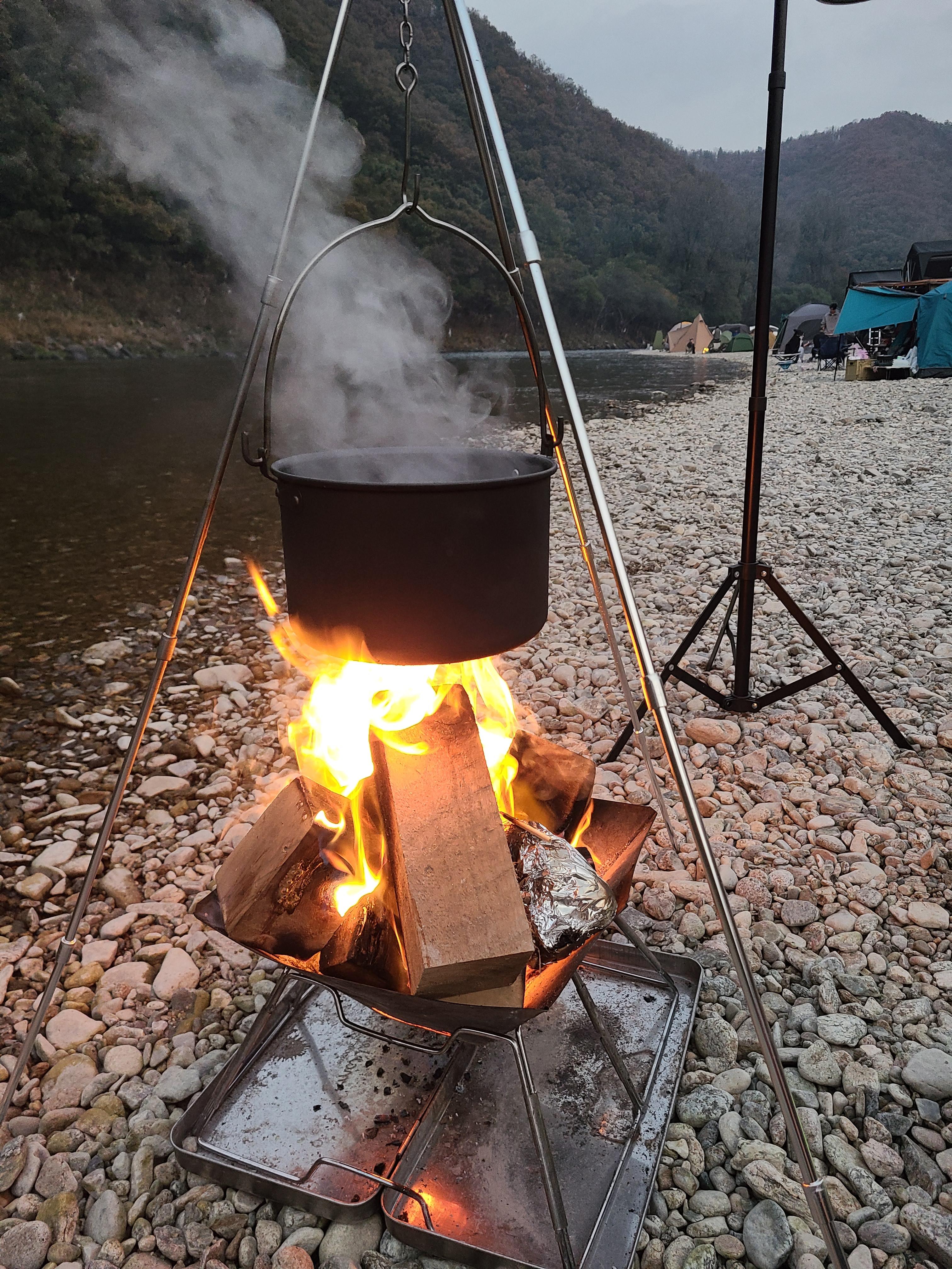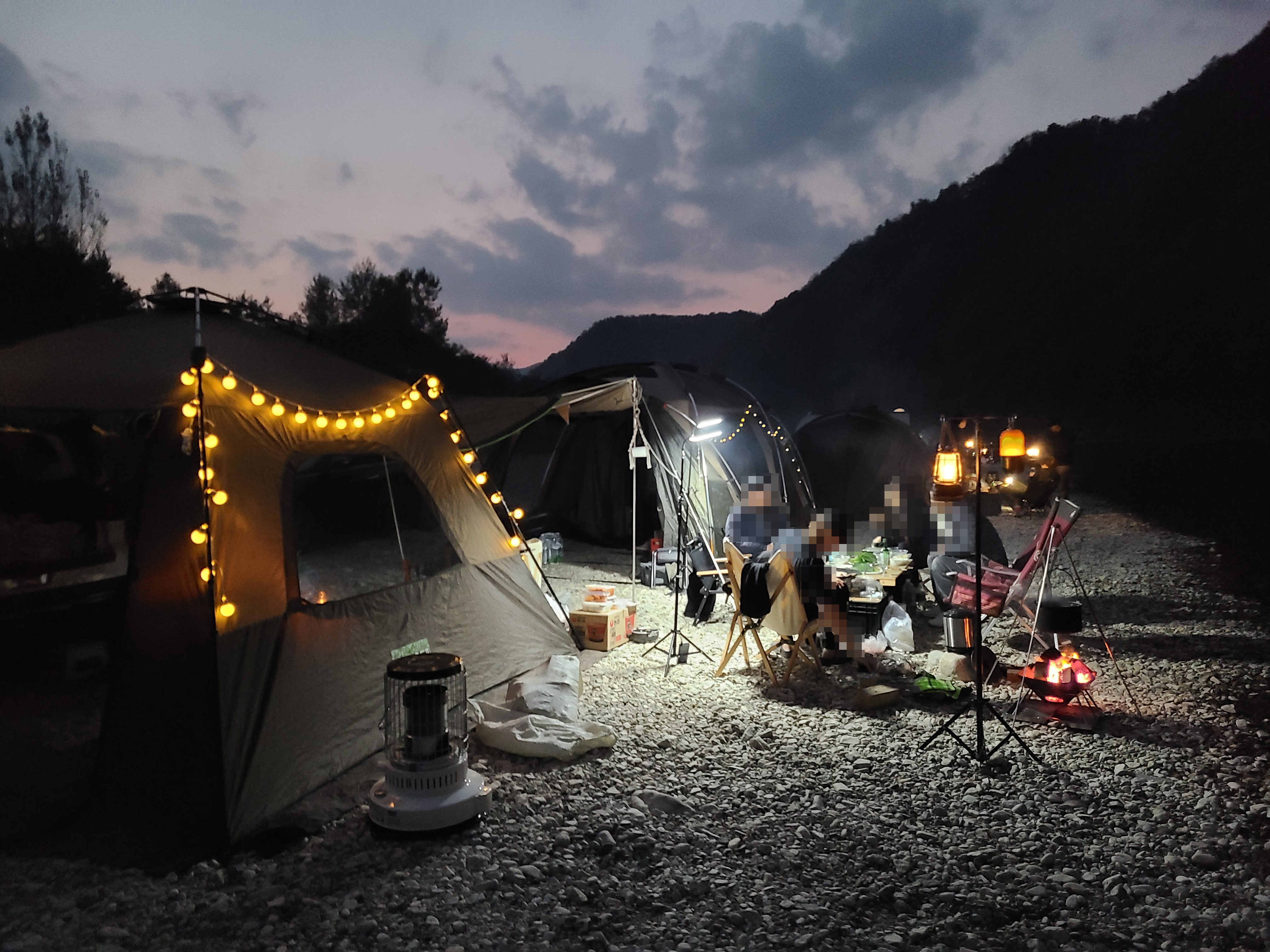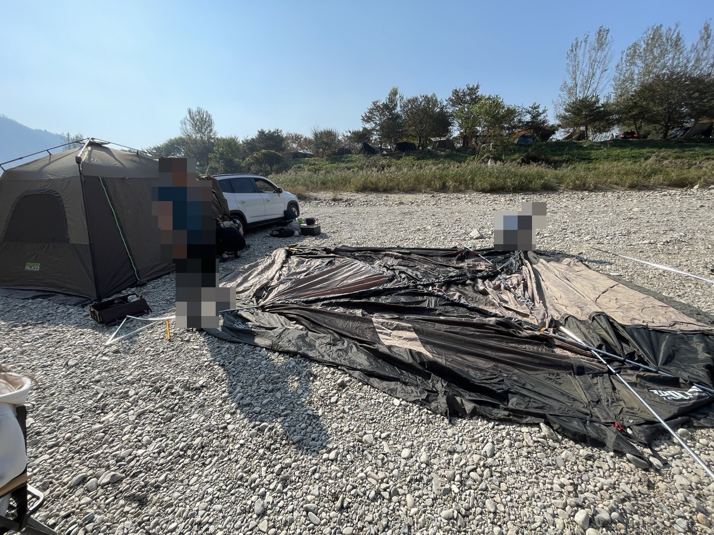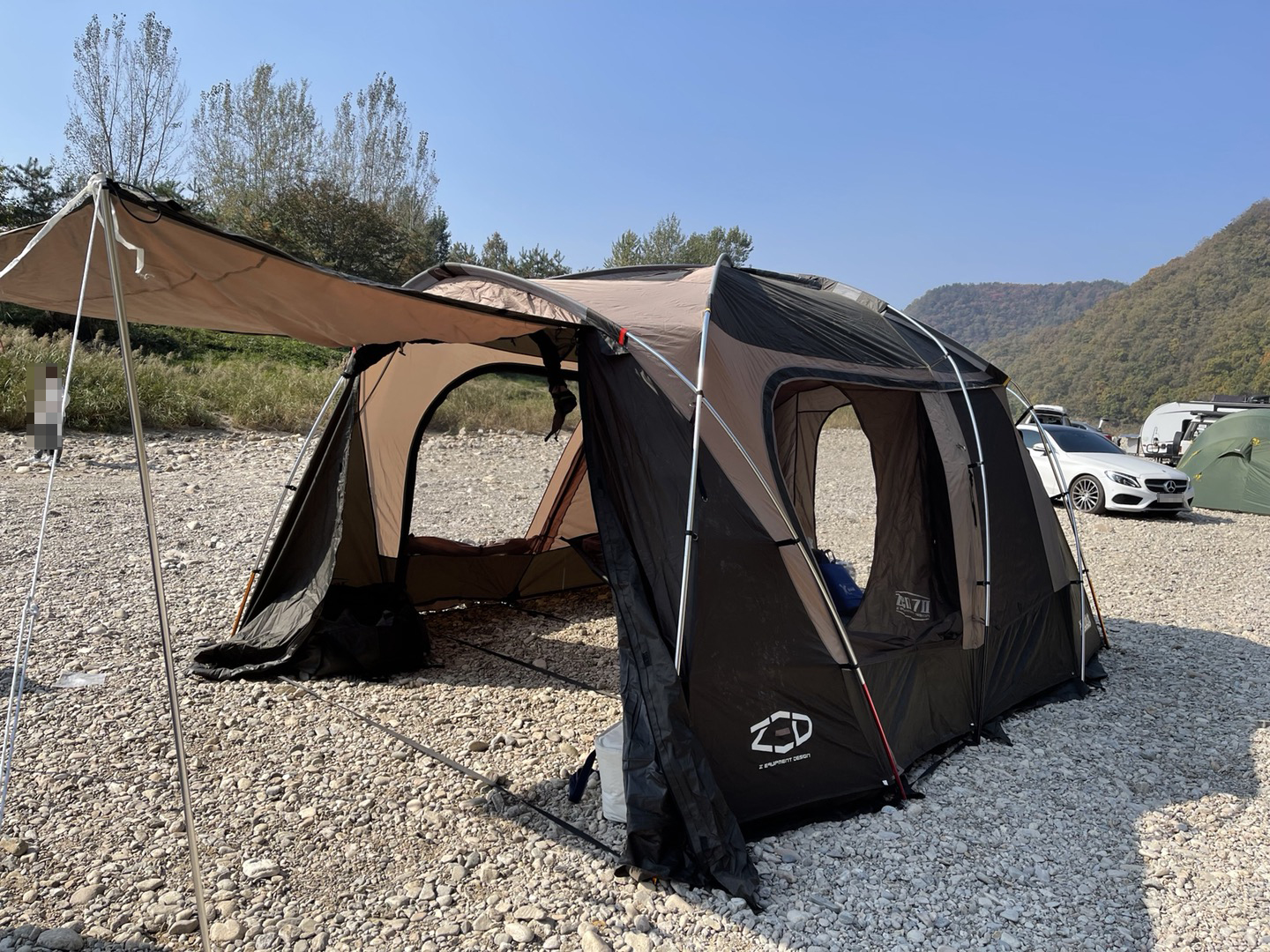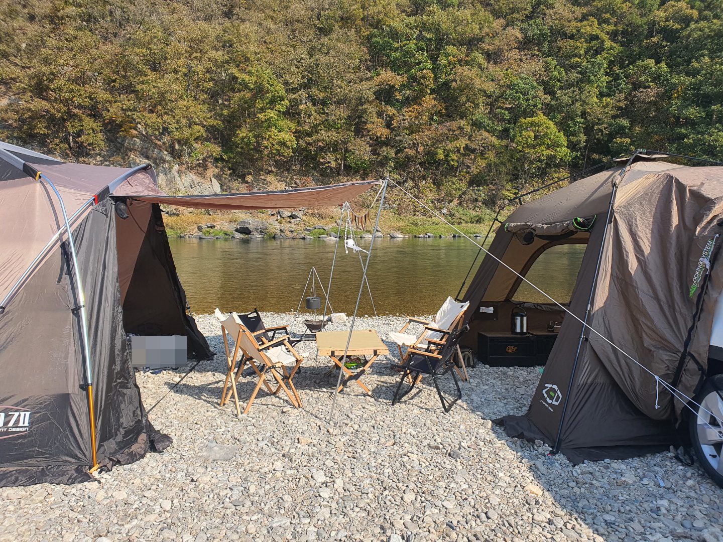 강 바로 앞은 경치는 너무 좋지만 자갈밭이기 때문에 바닥이 고르지 못하다는 단점이 있습니다.