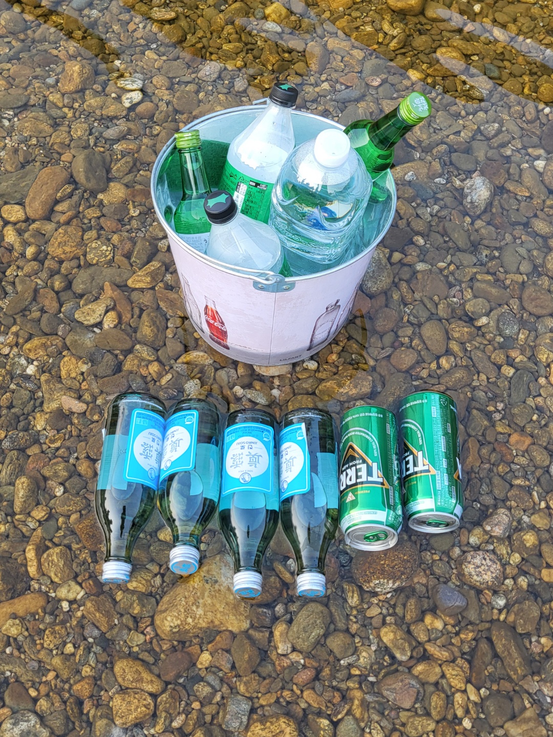 물과 술, 음료수를 통에 담아 홍천강물에 담가두고요.^^