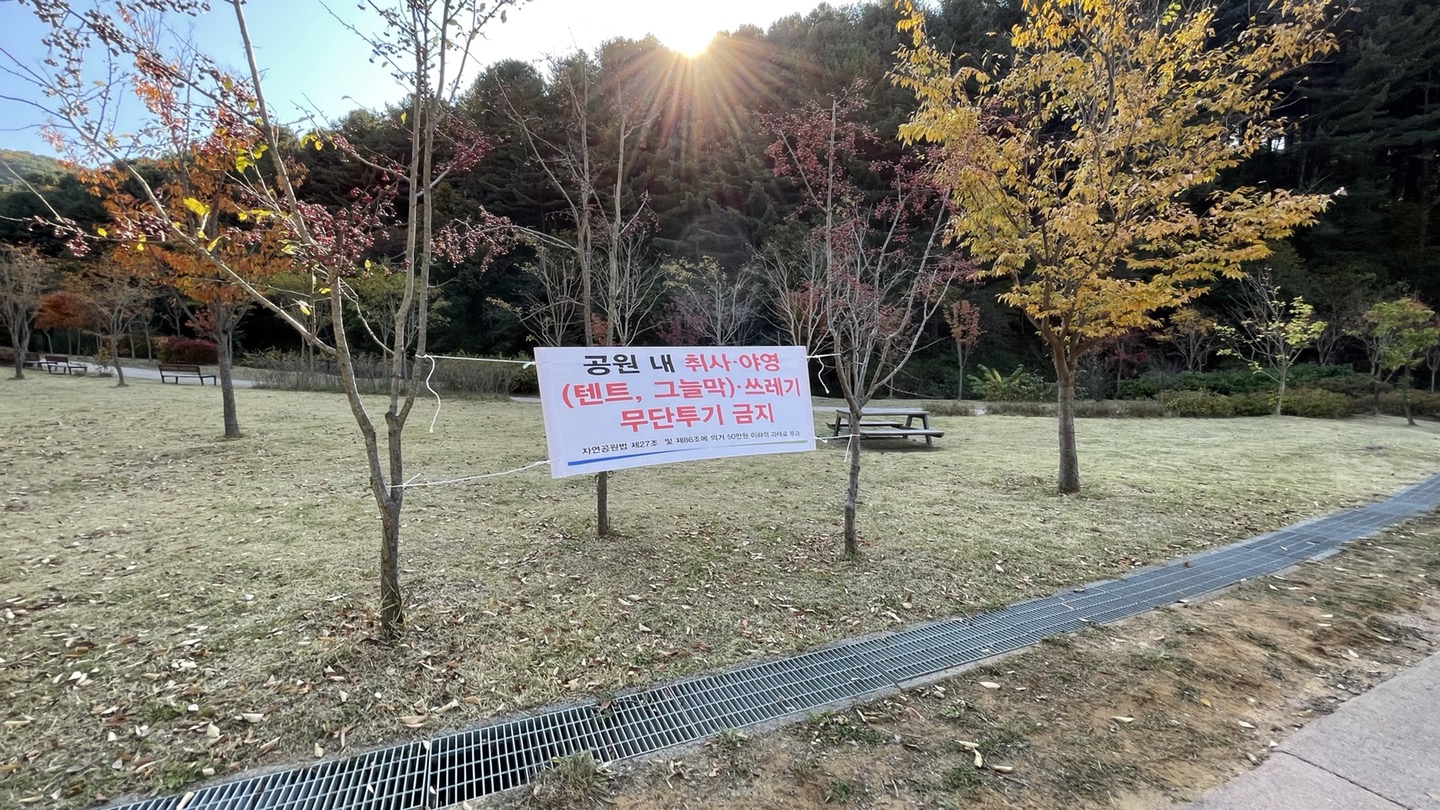 공원 내 취사/야영(텐트, 그늘막)은 금지되어 있고요, 쓰레기 무단투기 또한 당연히 금지입니다.