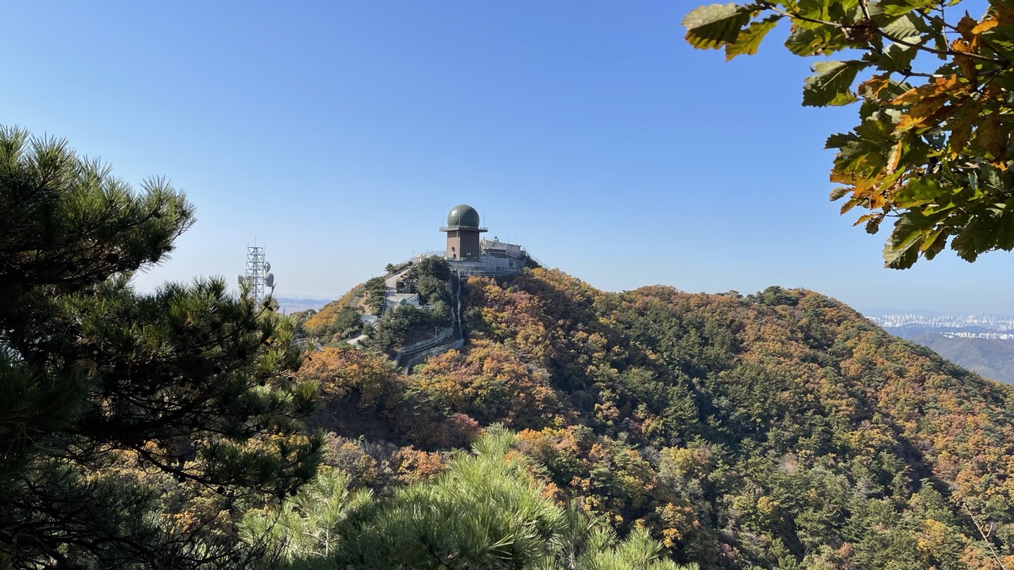옆 봉우리에 군부대 기상관측소가 보입니다.