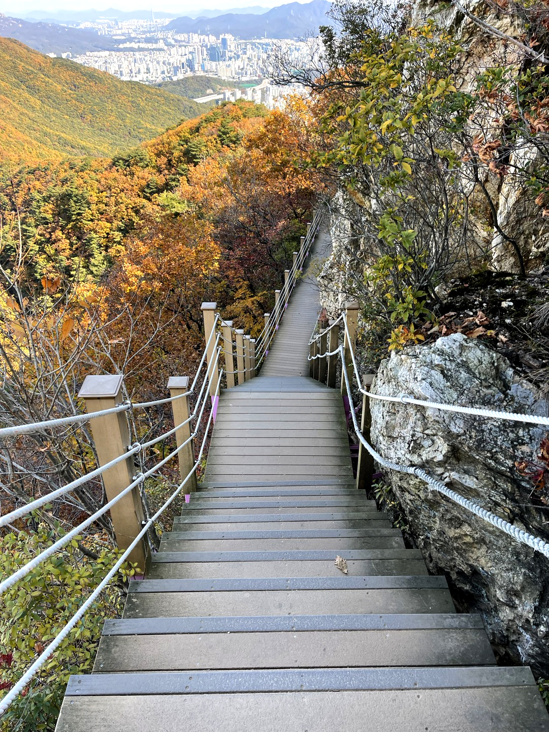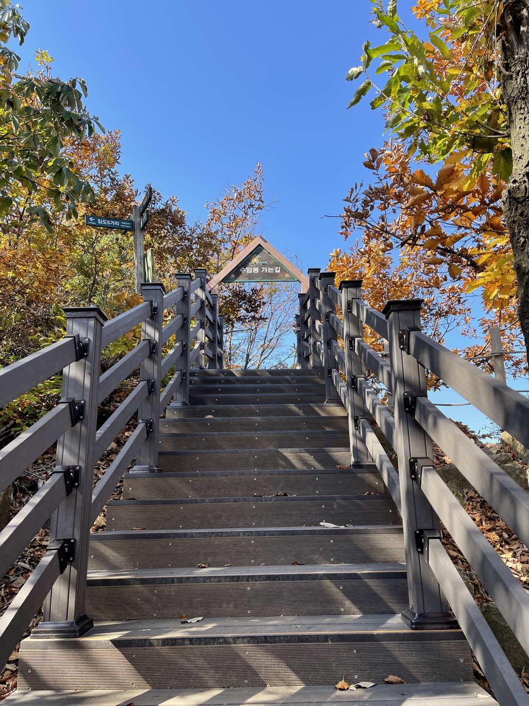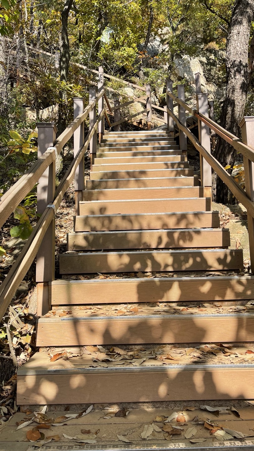 돌길이 가파른데다 낙엽으로 인해 길이 미끄럽다보니 올라오는 내내 좀 무서웠어요. 나무데크 계단이 나오면 무지 반가웠습니다. ㅎ