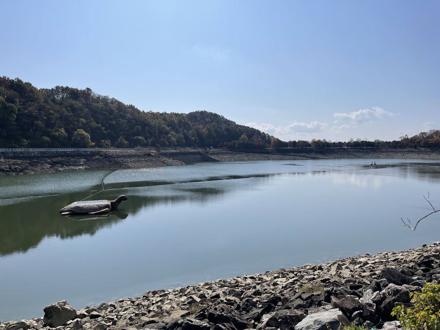 호수 한가운데 떠 있는 '하늘 거북이' 등딱지 위에 설치되어 있는 태양 집열판도 의아했습니다.