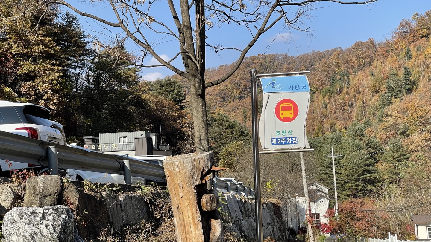 음...빨간색버스는 관광객이 몰리는 시기에 일시적으로 운행하는 듯 보였어요. 제1주차장에서 호명산 정상까지 운행하는 것 같은데, 확인은 안해봐서 정확히 모르겠네요;; 번호도 지워진걸 보니 기존에 운행하던 노선버스를 셔틀로 활용하고 있는게 아닌가 싶습니다.