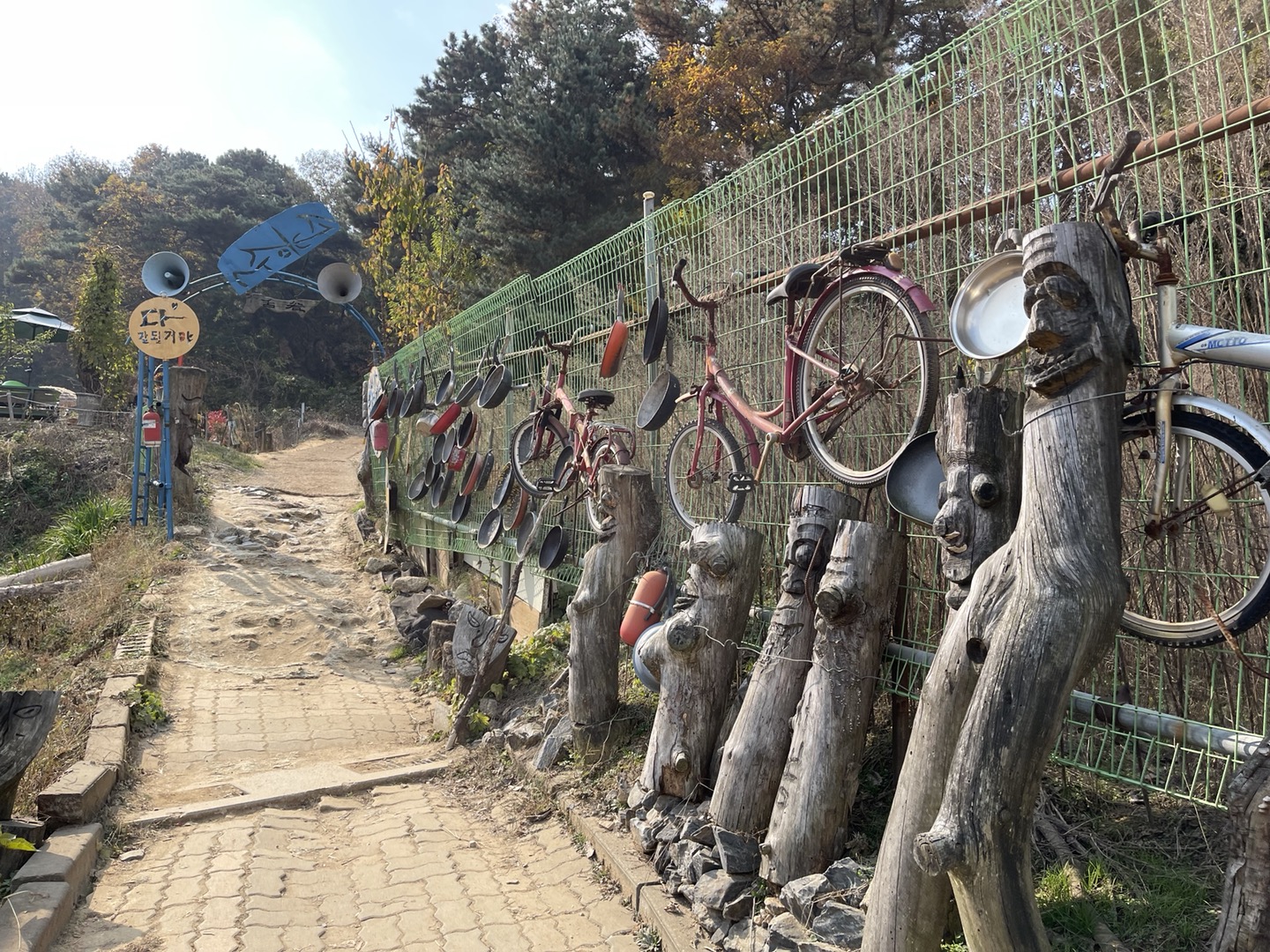 서봉산 등산로 입구에는 나무조각 작품과 후라이팬과 자전거를 재활용한 작품들이 줄지어 있습니다.