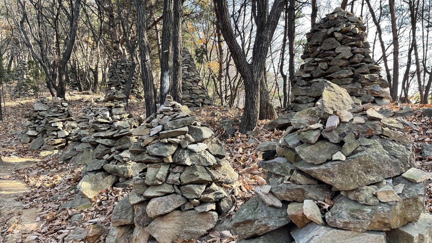 길 한쪽에 돌탑들이 보입니다. 산에는 항상 크고 작은 돌탑들이 있으니 그려려니 할 수 있지만 심상치 않은 돌탑이에요.