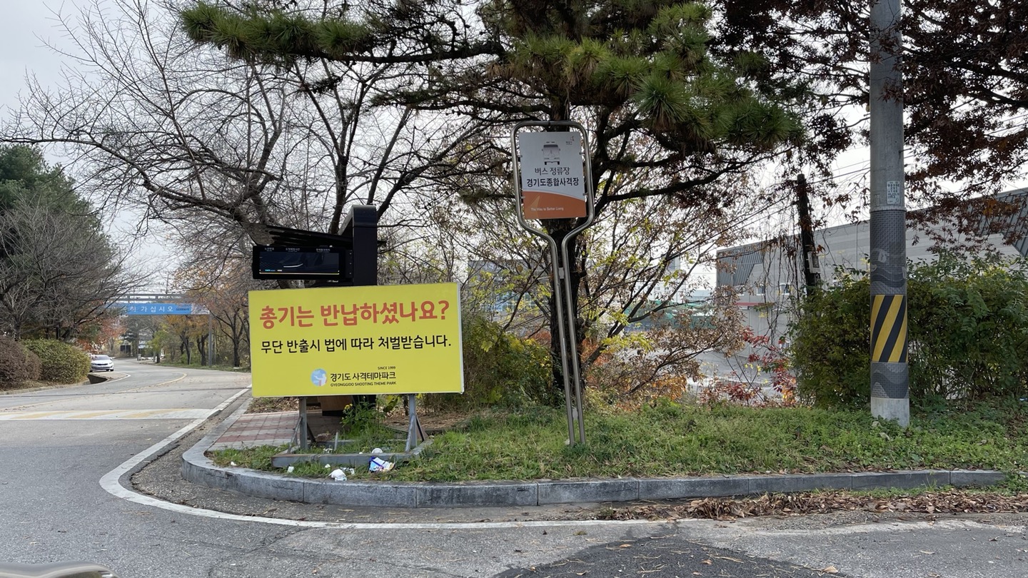 경기도 사격테마파크 입구 앞에 버스정류장이 있어요. 79번 버스 노선이 붙어있네요.