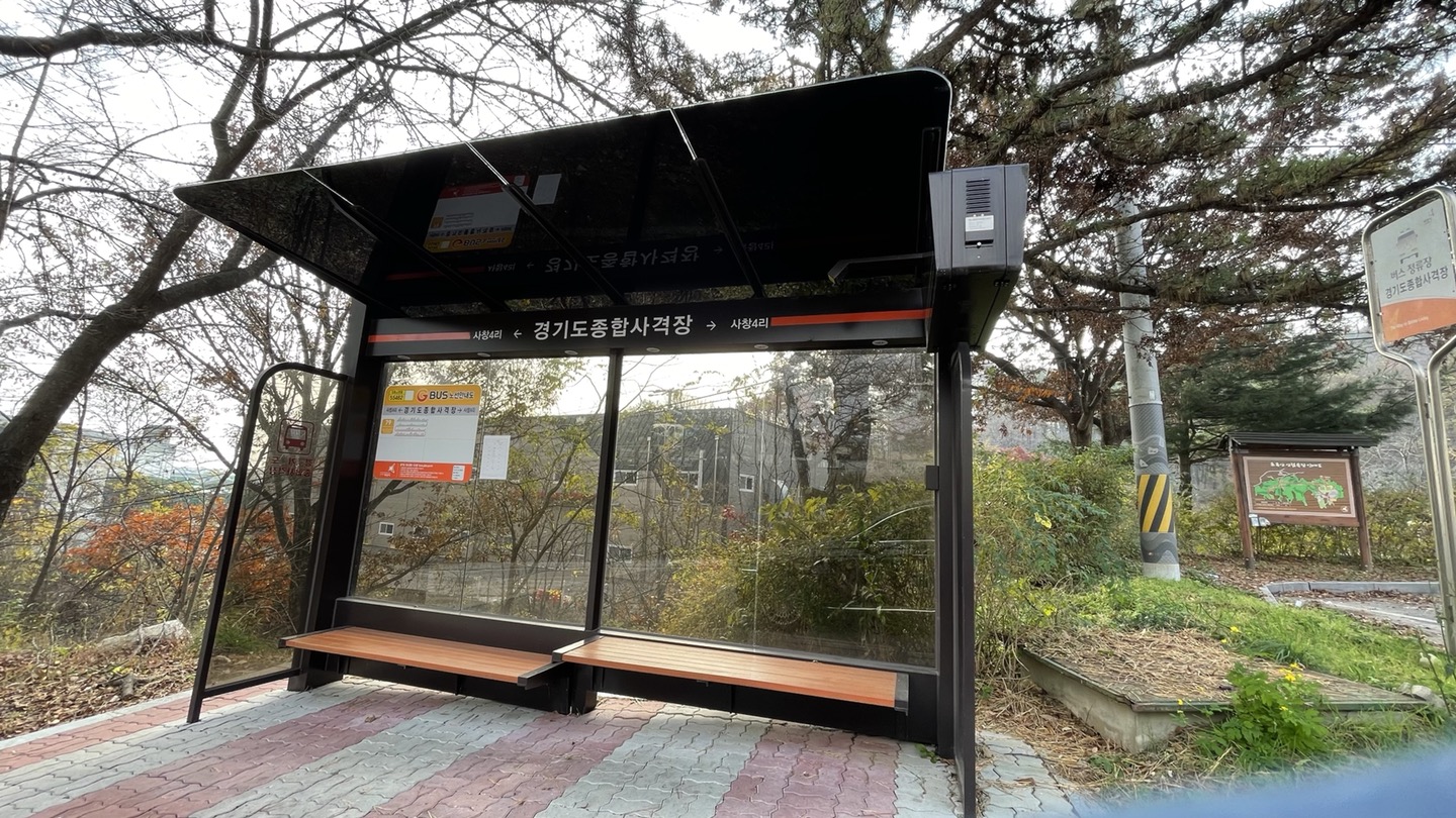 경기도 사격테마파크 입구 앞에 버스정류장이 있어요. 79번 버스 노선이 붙어있네요.