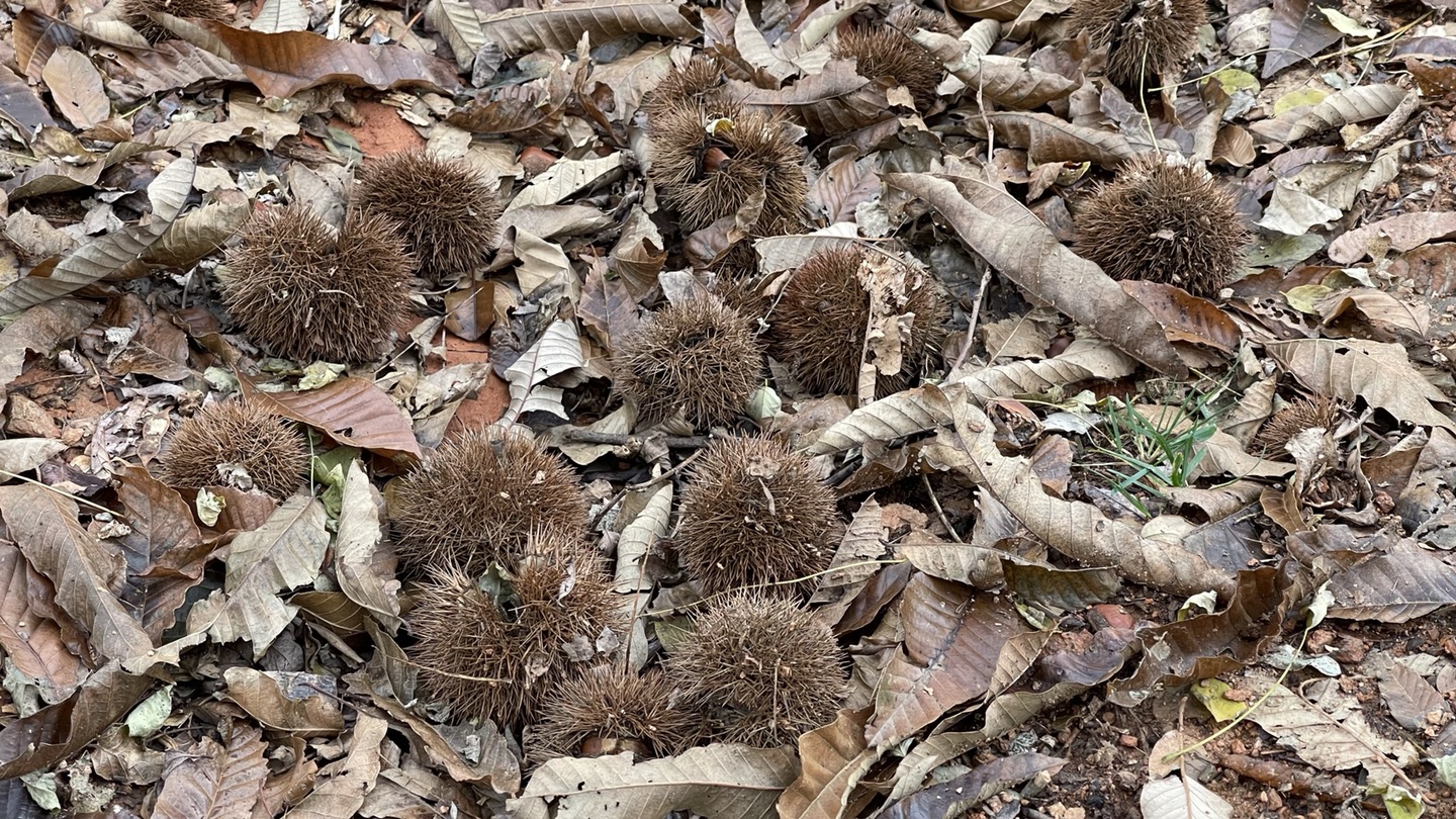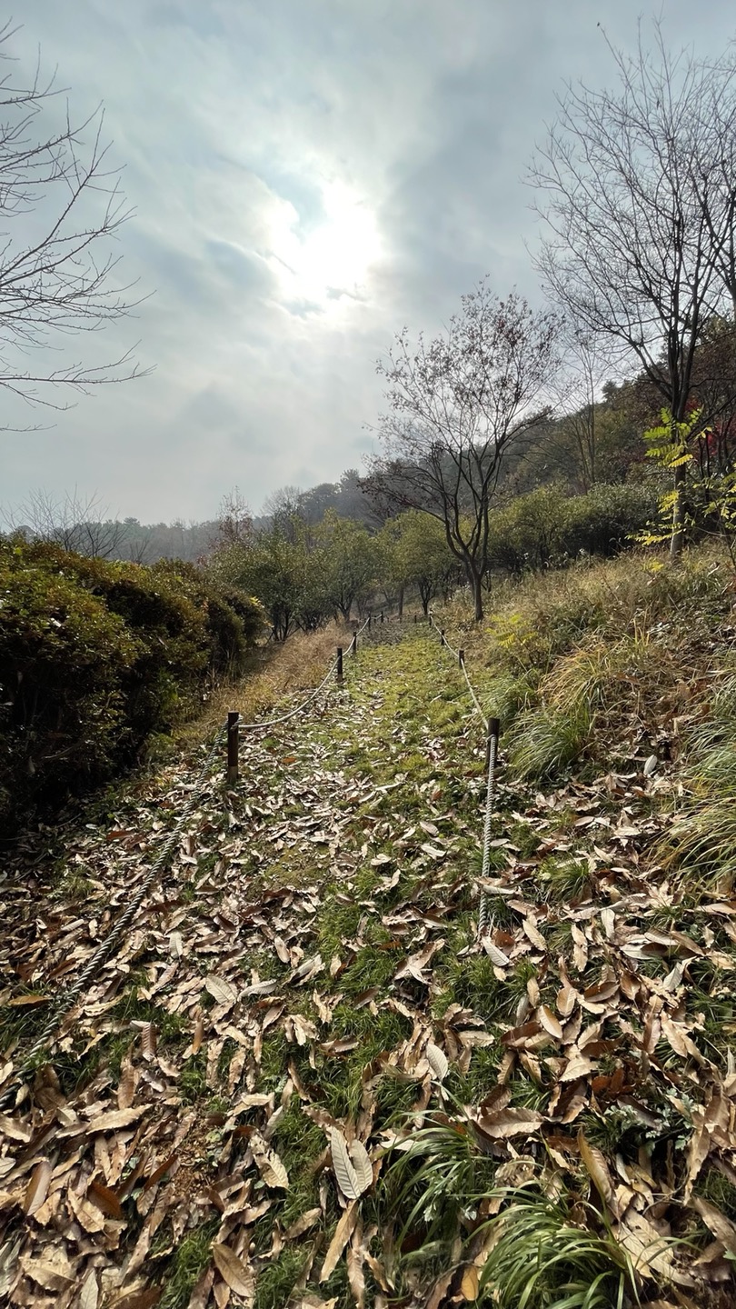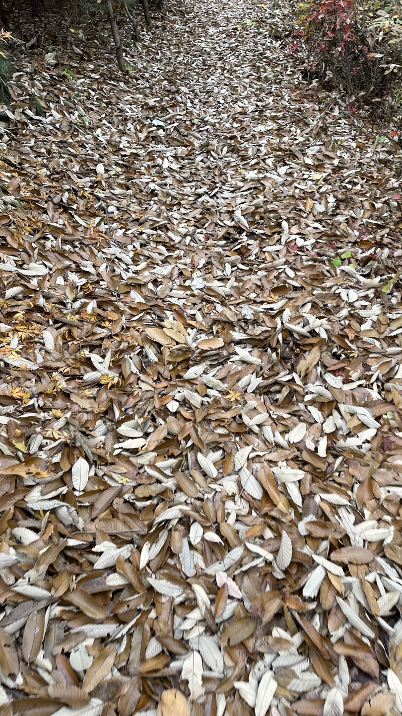 초록산 산림욕장에는 밤나무들이 많은데요, 그래서 산책로가 밤나무잎으로 가득해요. 푹신푹신~!