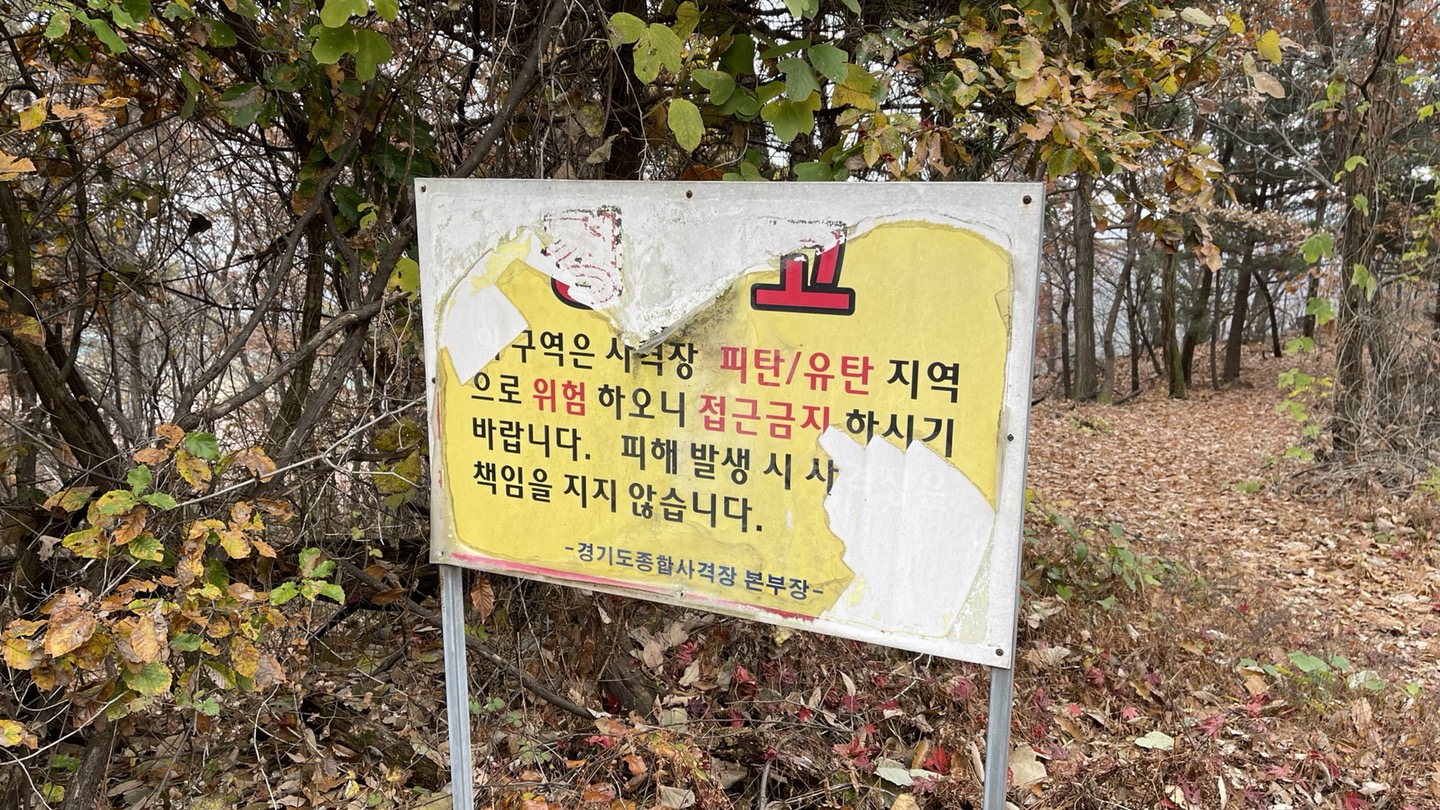 '이 구역은 사격장 피탄/유탄 지역으로 위험 하오니 접근금지 하시기 바랍니다. 피해 발생 시 사격장은 책임을 지지 않습니다.'라는 내용이에요.
