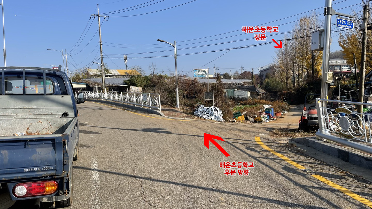 네비에 '해운초등학교'를 검색해서 가다보면 학교 앞 버스정류장(정류장명:궁평2리.해운초등학교) 뒤쪽 도로에 주차박스가 그려져 있습니다.