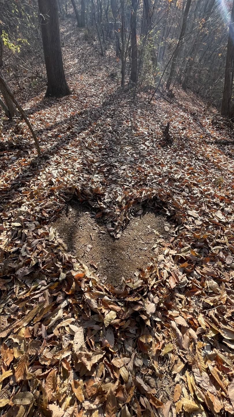 잠깐 쉬는 동안, 푹신하게 깔려있는 낙엽으로 예술혼?을 불태워보고 다시 출발~