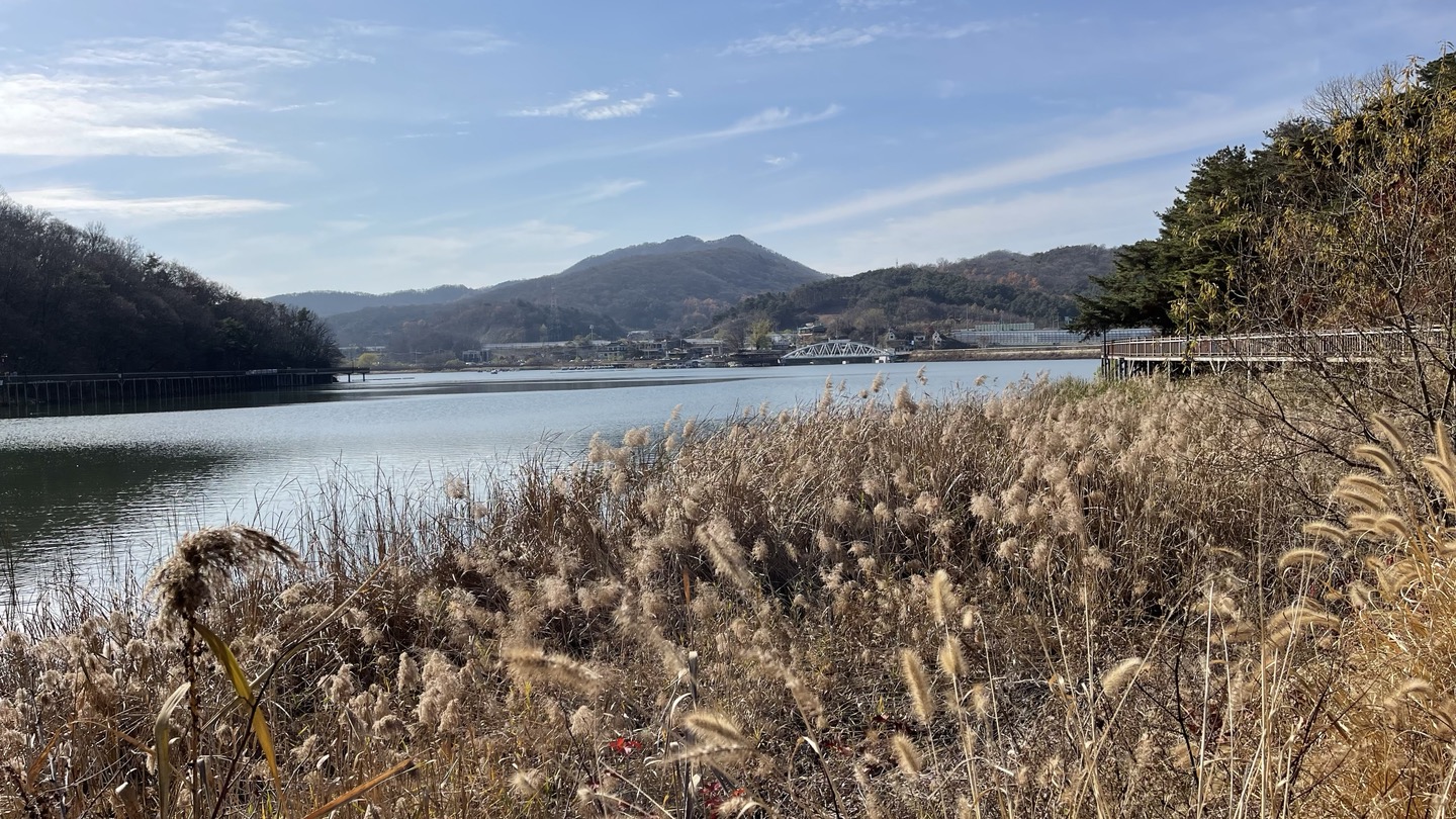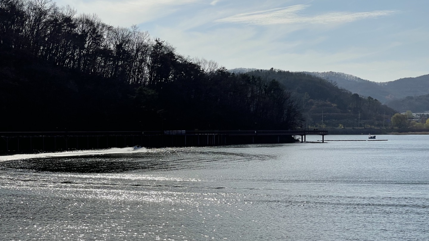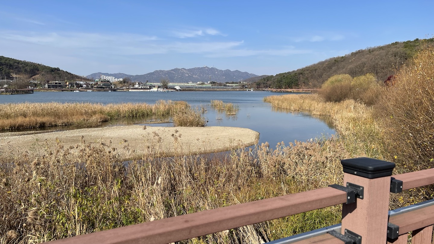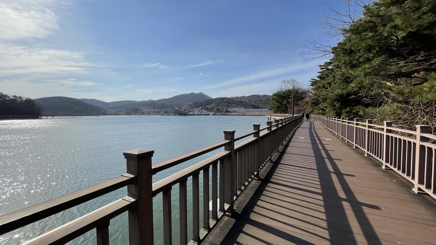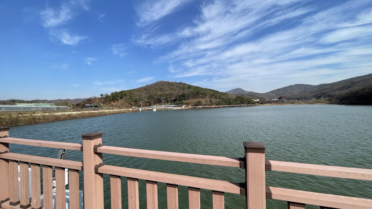 주차장에서 제방으로 이어진 계단을 올라가면 탁 트인 백운호수의 풍경이 한 눈에 펼쳐집니다.