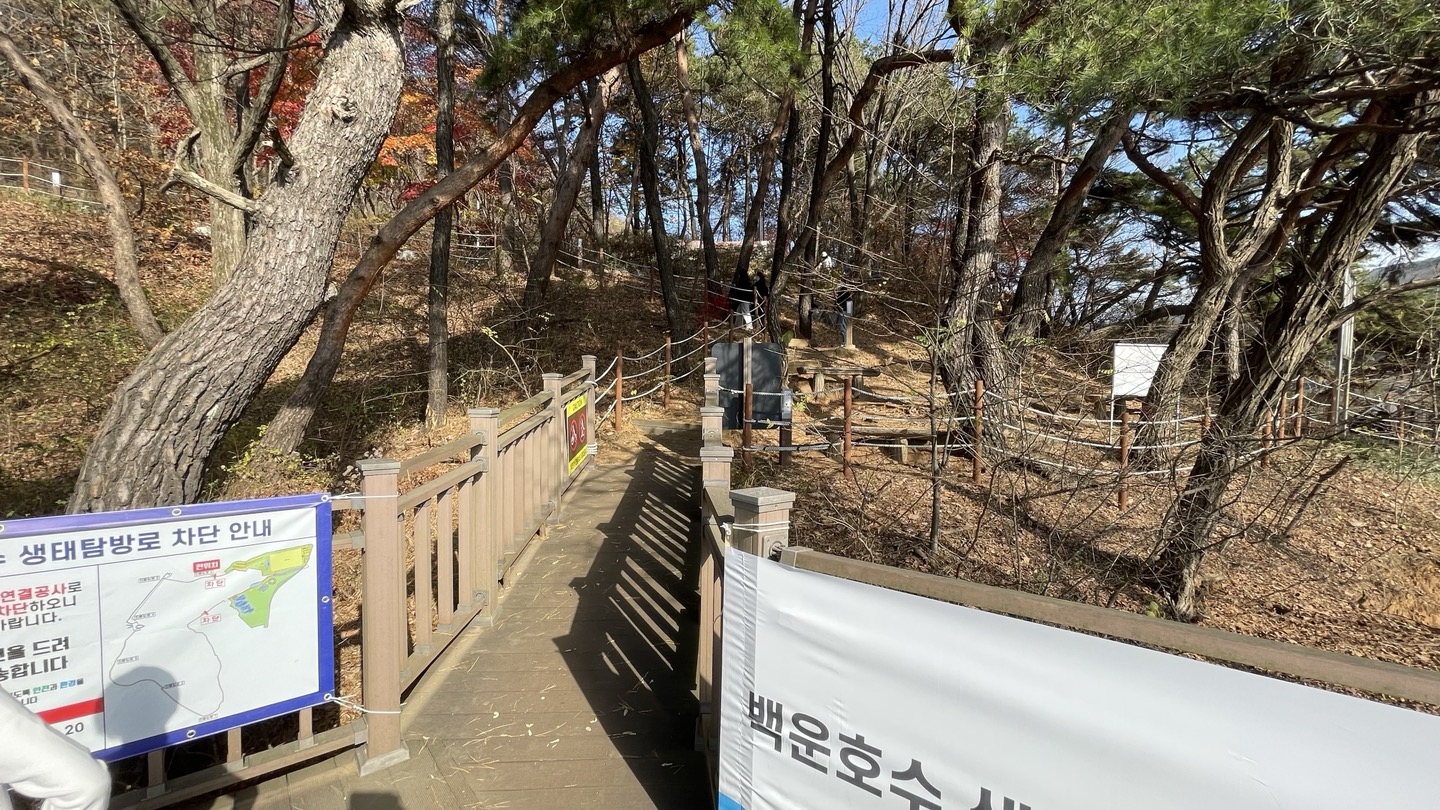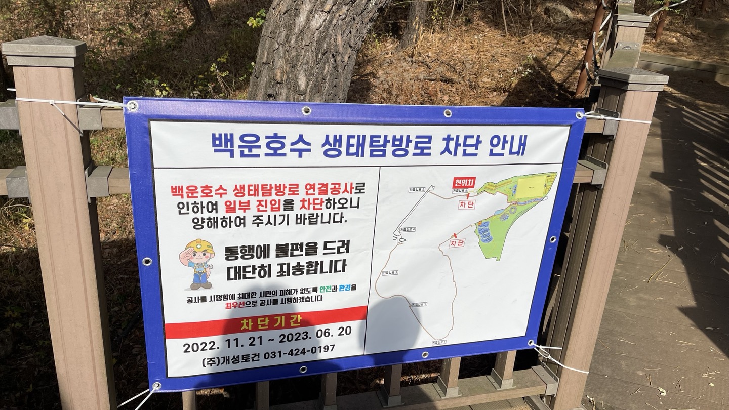 탐방로 연결공사로 인해 일부구간은 차단한다는 안내문이 보이네요.(차단기간 : 2022.11.21~2023.06.20)