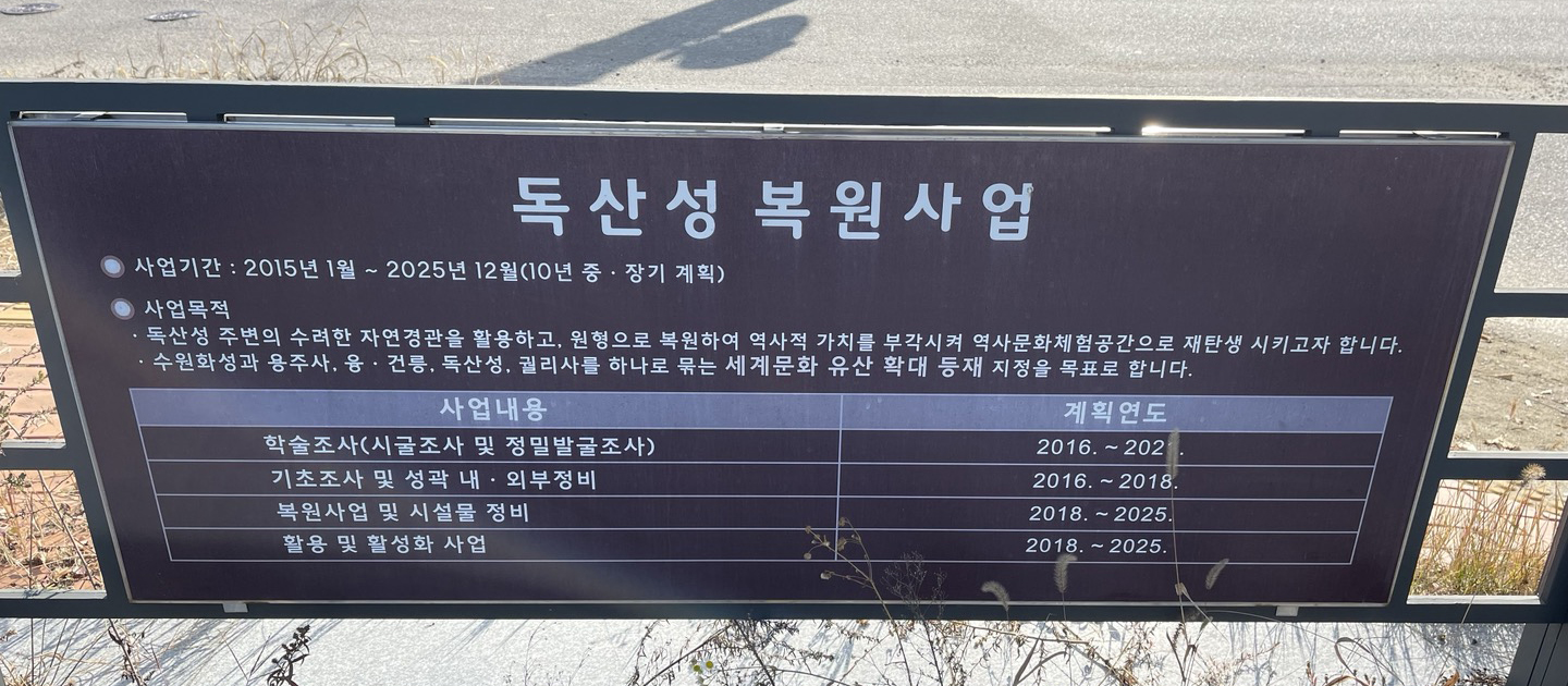 독산성은 2015년부터 2025년까지 복원사업이 진행중입니다. 독산성 주변 자연경관 활용과 함께 수원화성, 용주사, 융건릉, 독상성, 궐리사를 하나로 묶는 세계문화유산 확대 등재 지정을 목표로 하고 있네요.