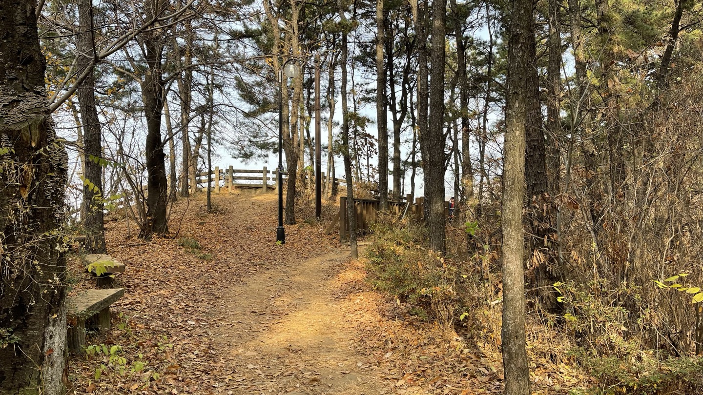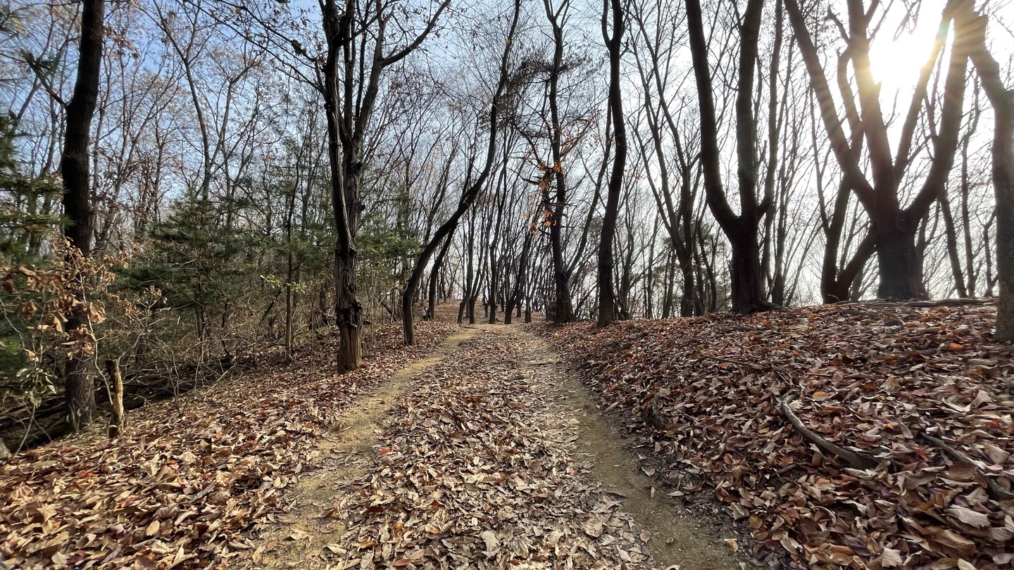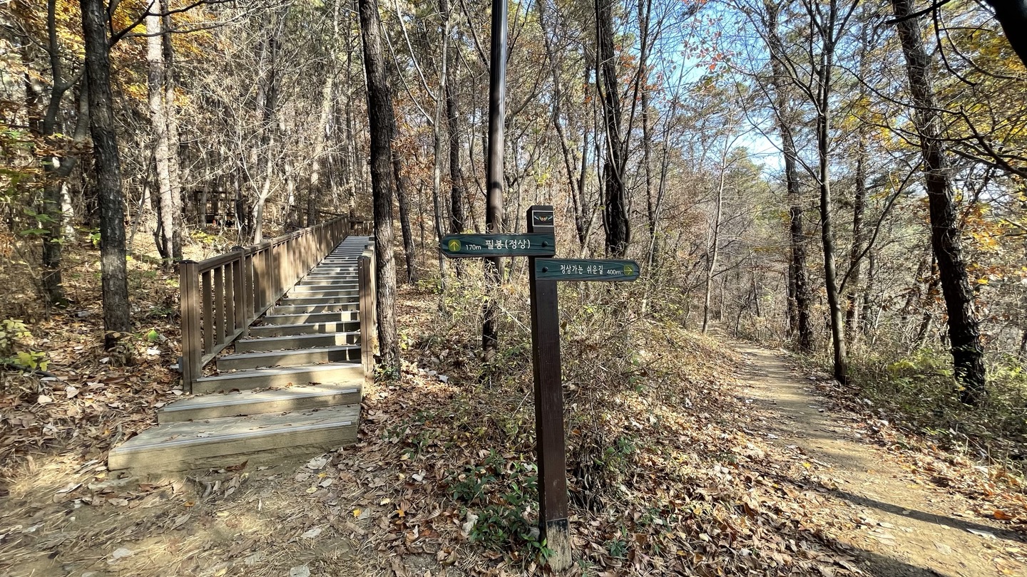 등산로는 전반적으로 난이도가 높지 않아요. 오르락 내리락하면서 조금 숨가쁘게 산책하는 정도에요.